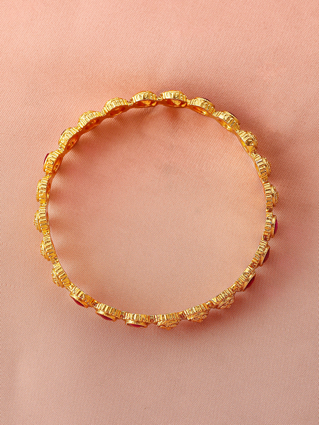 These exquisite 22K gold-plated bangles by Rubans are a timeless addition to your jewelry collection. Featuring intricate floral filigree craftsmanship, the bangles are beautifully adorned with ruby-colored accents, adding a regal charm to the design. Their delicate detailing and luxurious finish make them perfect for weddings, festive occasions, or special celebrations.