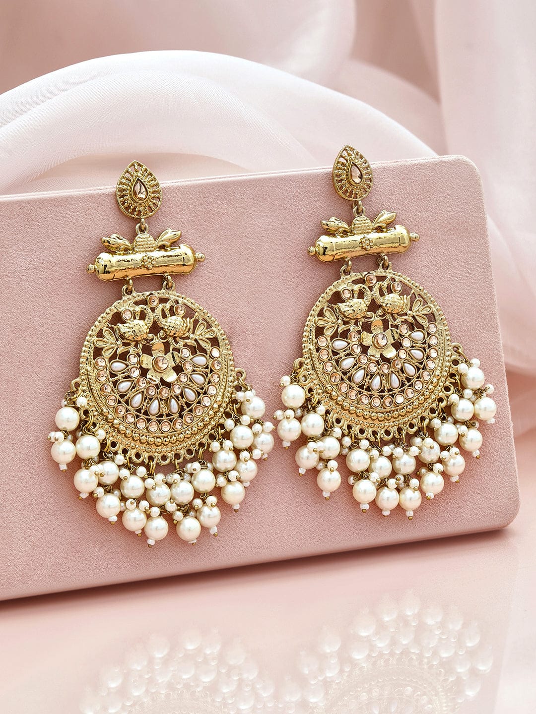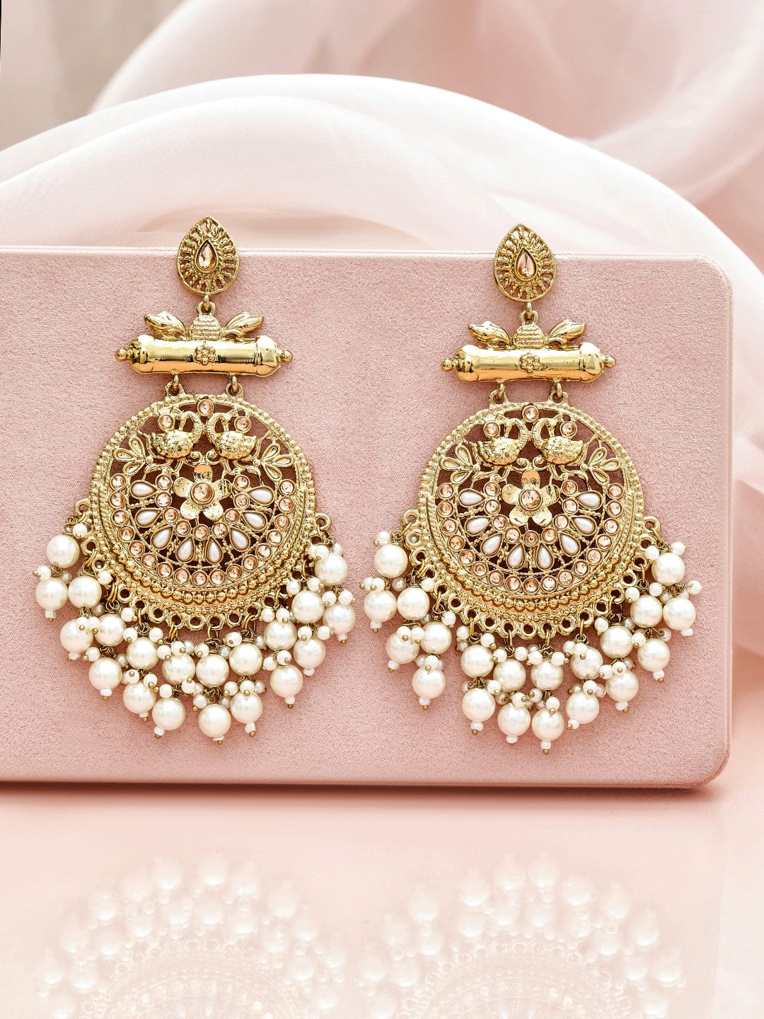 Chandbali Earrings : Exude regal elegance with these 18K antique gold-plated crescent-shaped chandbalis. Embellished with sparkling stones and glossy white pearl beads, they offer a luxurious and timeless design.