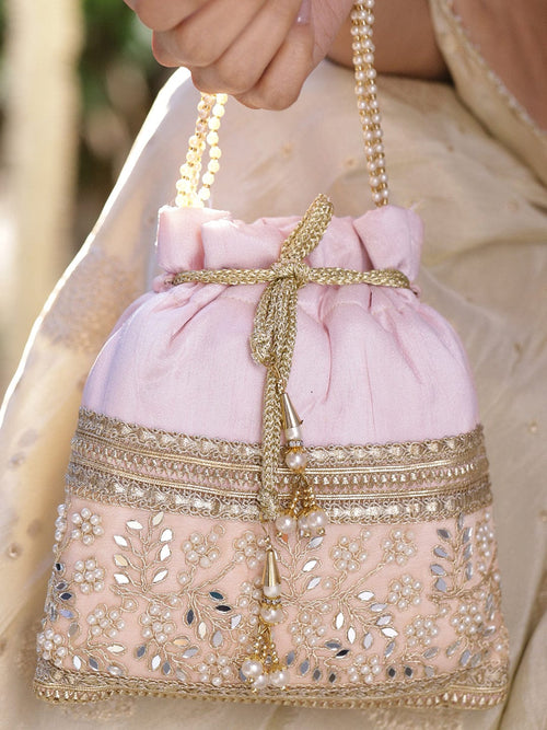 Rubans Pastel Pink Potli Bag with Golden Zari, Mirror & Floral Embroidery & Beaded Handle