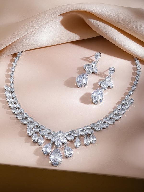 Jewellery Set : Rubans Rhodium-Plated Necklace Set with leafy V-shape design, Cubic Zirconia crystals, and teardrop danglers. Paired with matching earrings, perfect for cocktail, party, and glamorous reception looks.