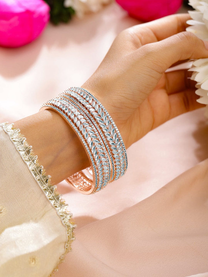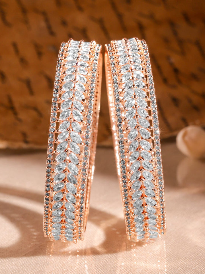 Rubans Set of 2 22K Rose Gold-Plated  White Cubic Zirconia Studded Leaf Motif Handcrafted Premium Bangles Bangles