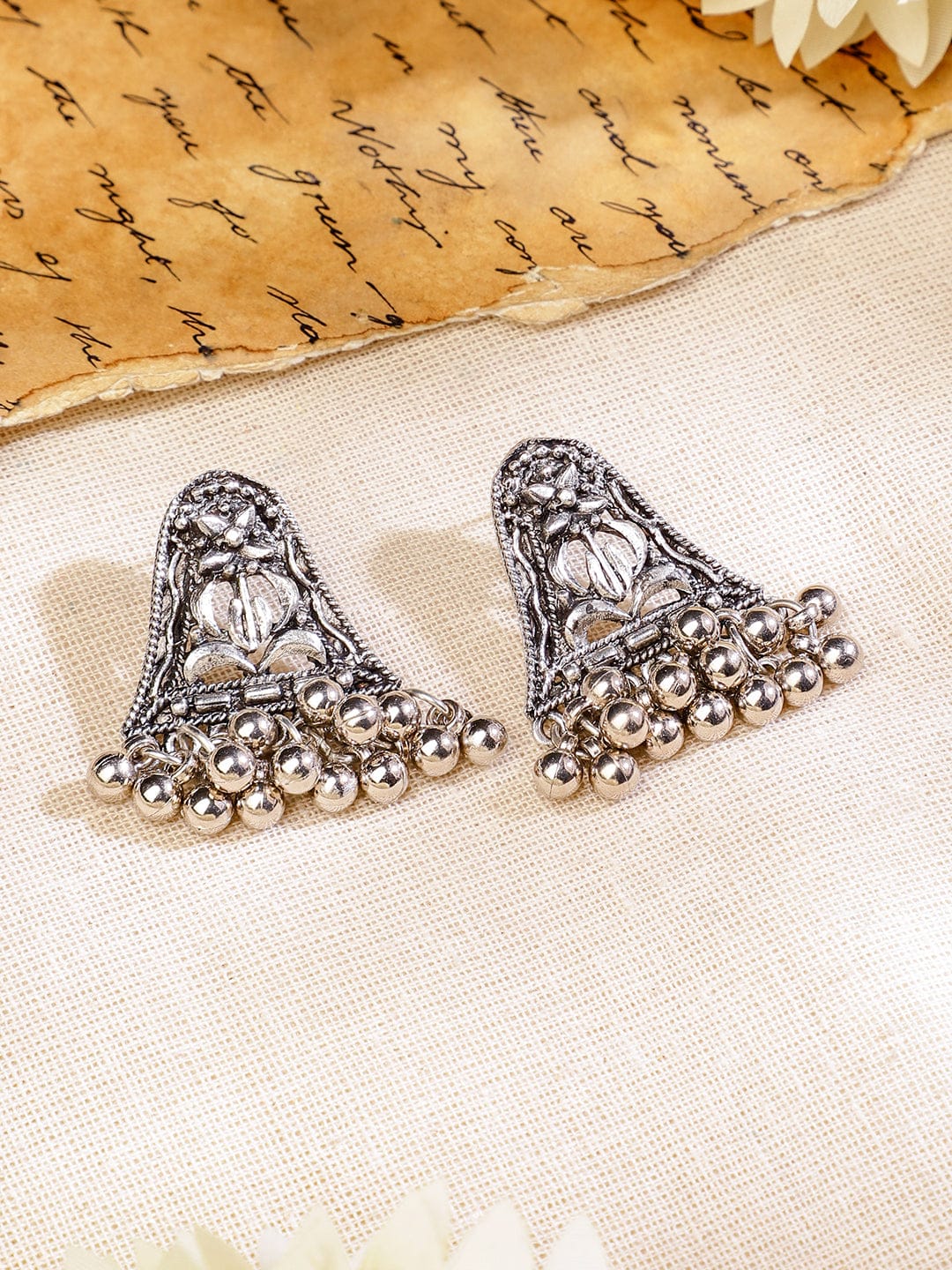 This oxidized silver-plated choker set features bold floral and leaf motifs with long chain tassels and ghungroo ball detailing. A handcrafted statement jewellery set for women, ideal for festive and special occasions.