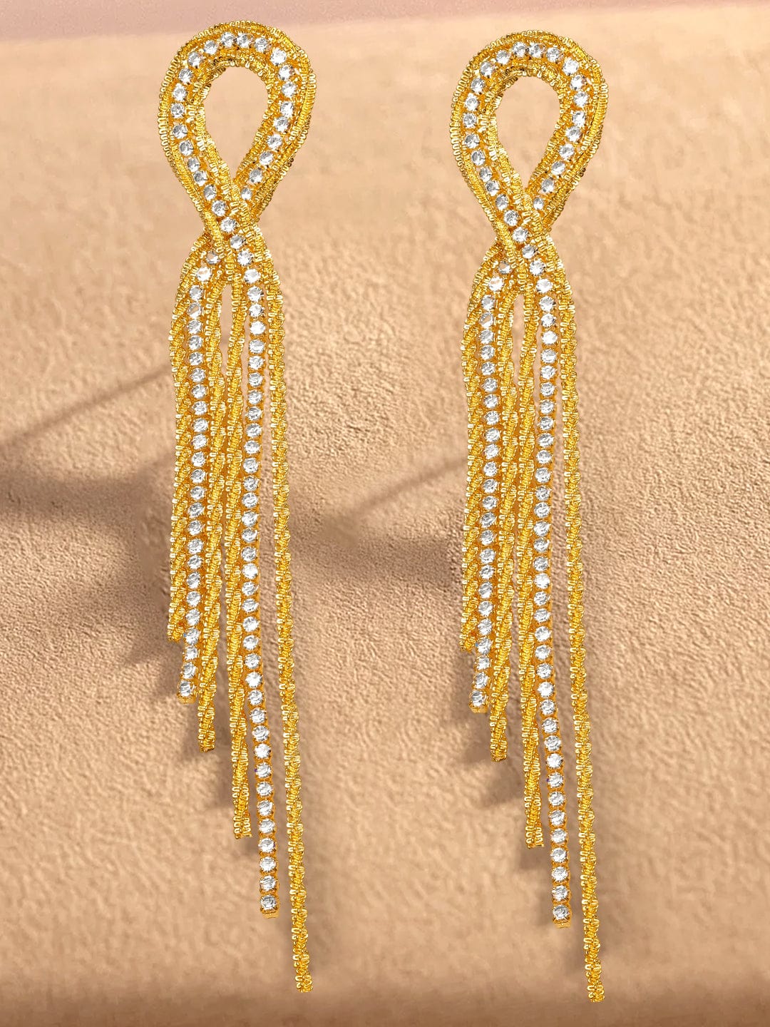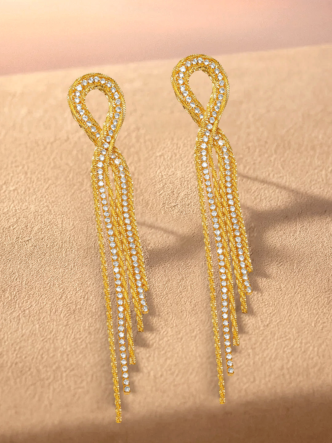 Earrings : Rubans 18K Gold Plated brass long tassel earrings adorned with sparkling crystal cubic zirconia, designed in a bold looped drop style for women & girls. Perfect for parties, cocktail nights, and special occasions.