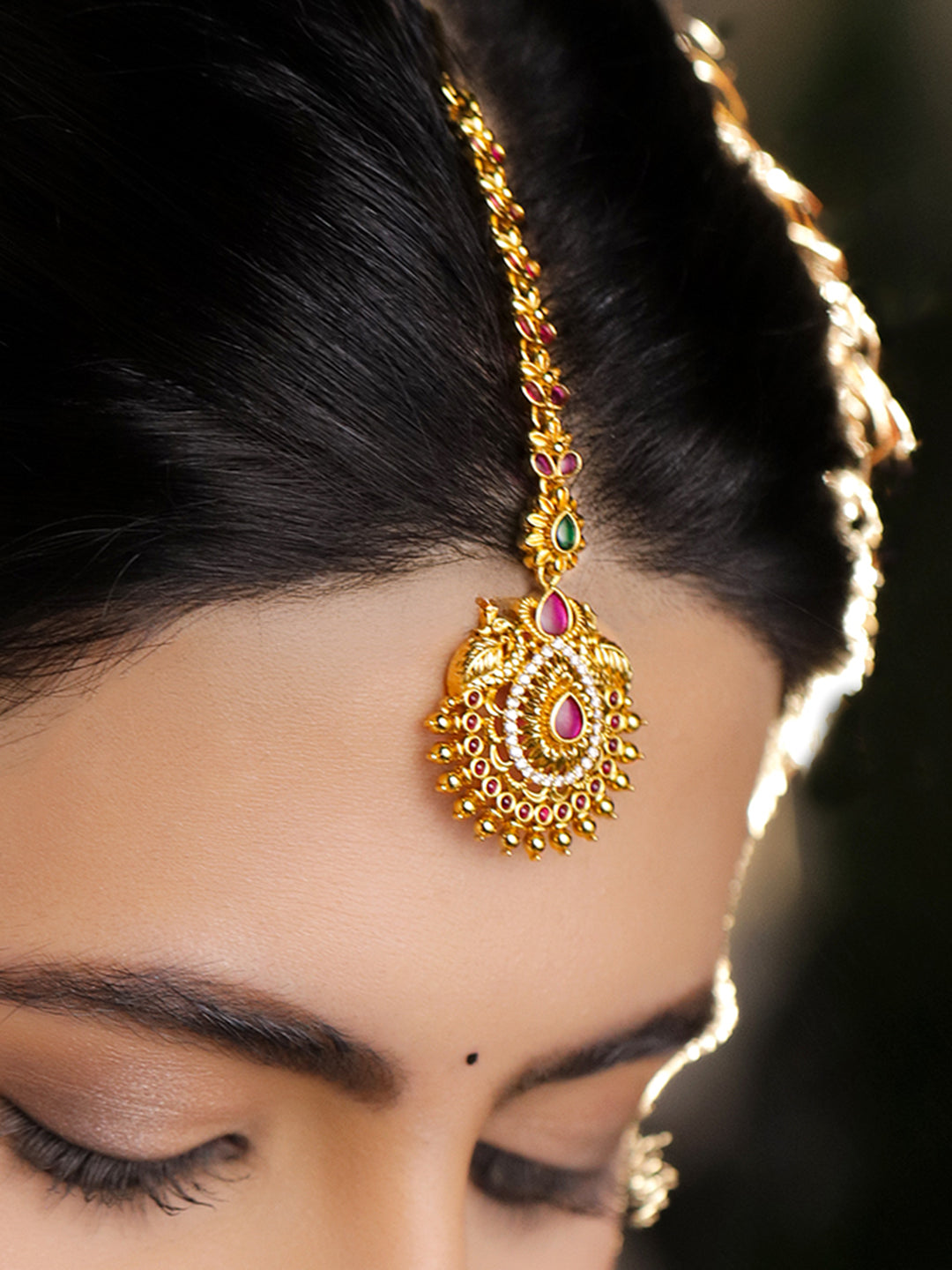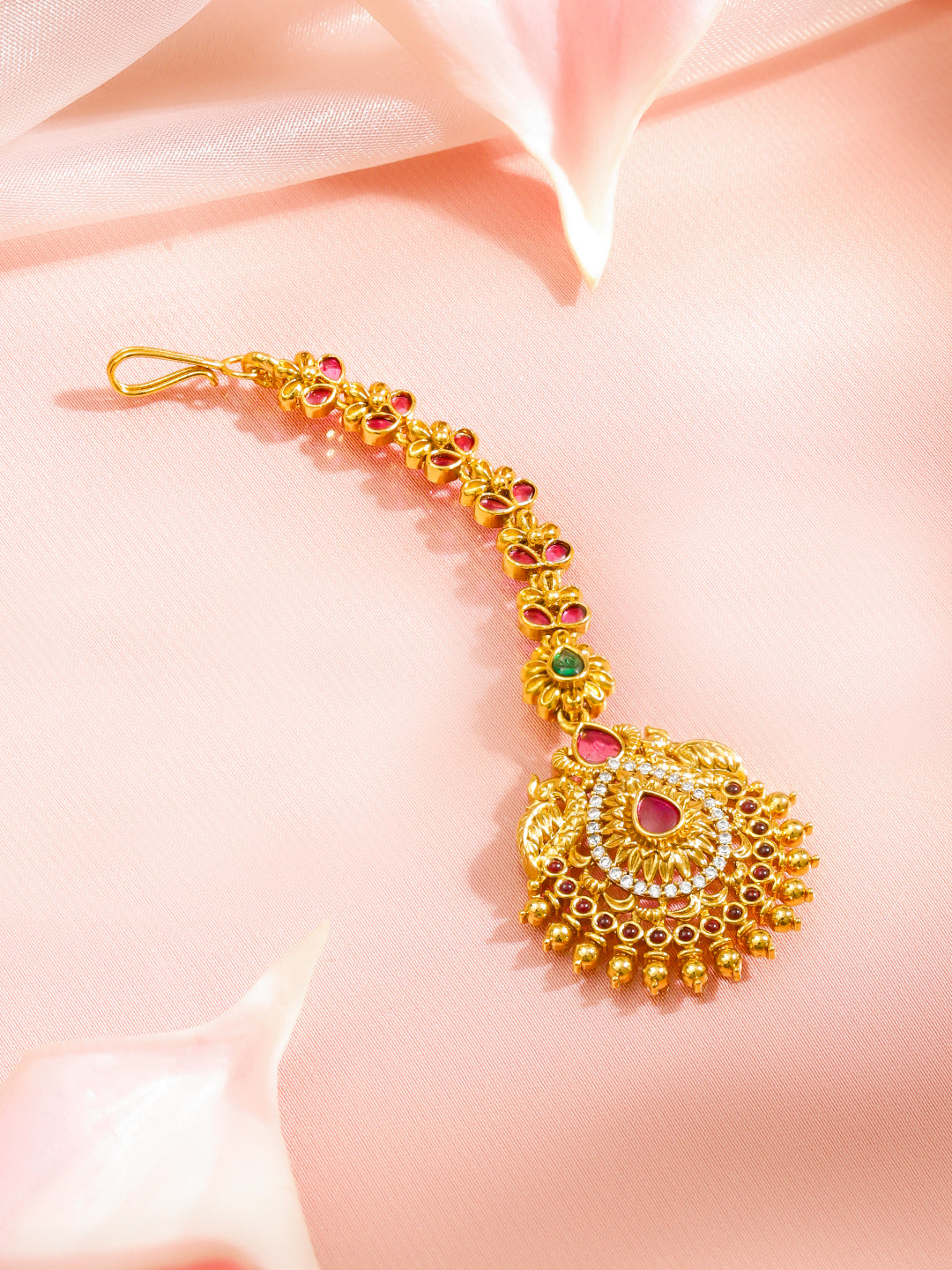 Maang Tikka : 22K gold-plated maang tikka crafted in brass with ruby red & emerald green Cubic Zirconia stones and golden beaded detailing. Perfect for bridal, festive & wedding looks.