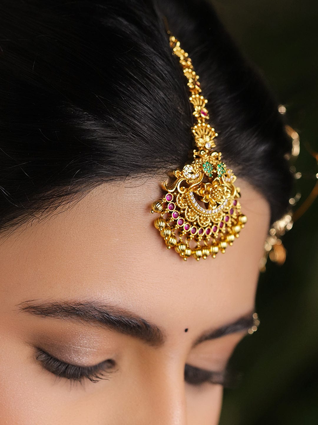 Maang Tikka : A 22K gold-plated temple design maang tikka, studded with ruby red & emerald green Cubic Zirconia stones, accented with pearl hangings. Perfect for weddings, festive occasions & ethnic celebrations.