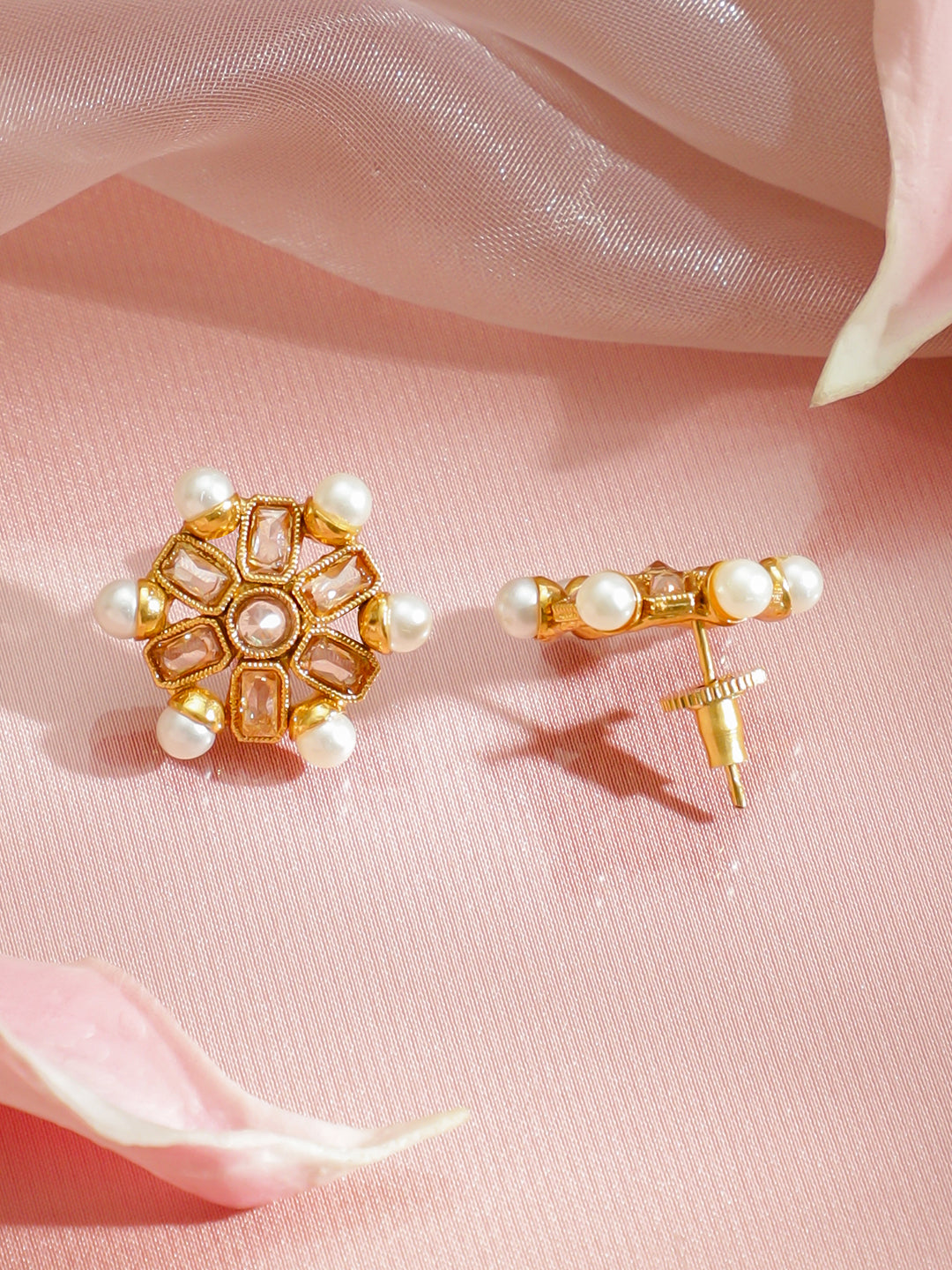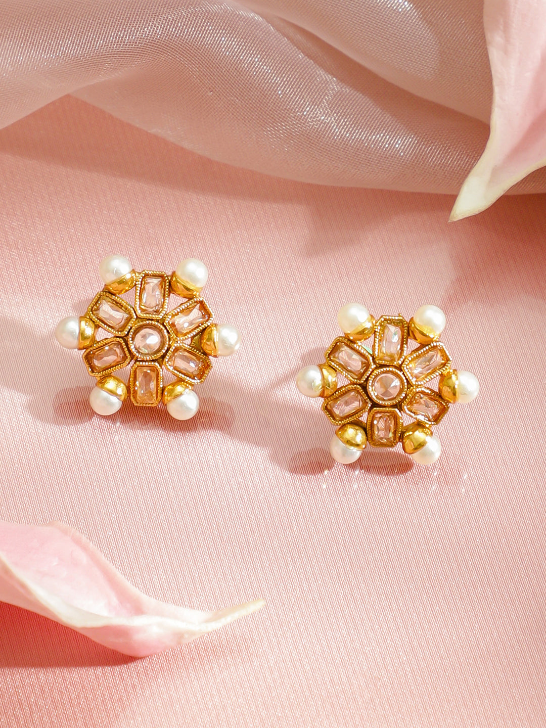 Necklace Set : This 18K gold-plated copper necklace set features white Kundan stones and pearl detailing, paired with floral stud earrings—perfect for adding timeless elegance to festive and wedding looks.