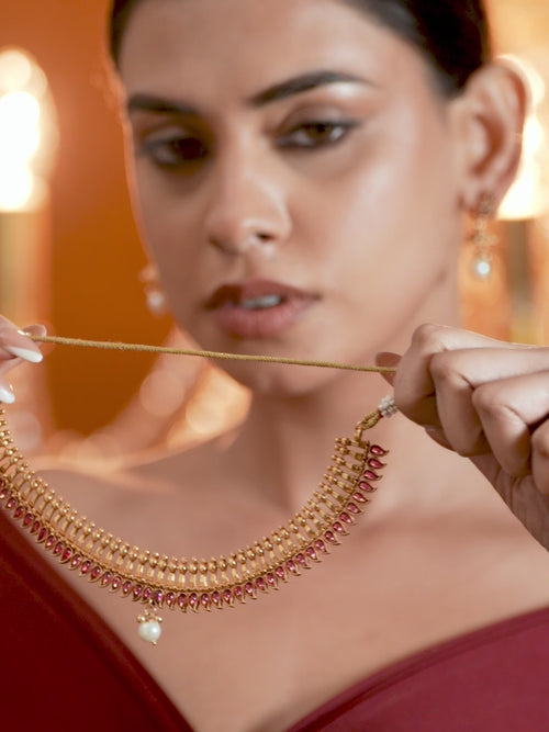 This 22K gold-plated jewellery set is adorned with vibrant pink stones and delicate pearl drops. Perfectly crafted for a timeless traditional look, it includes a matching necklace and earrings.