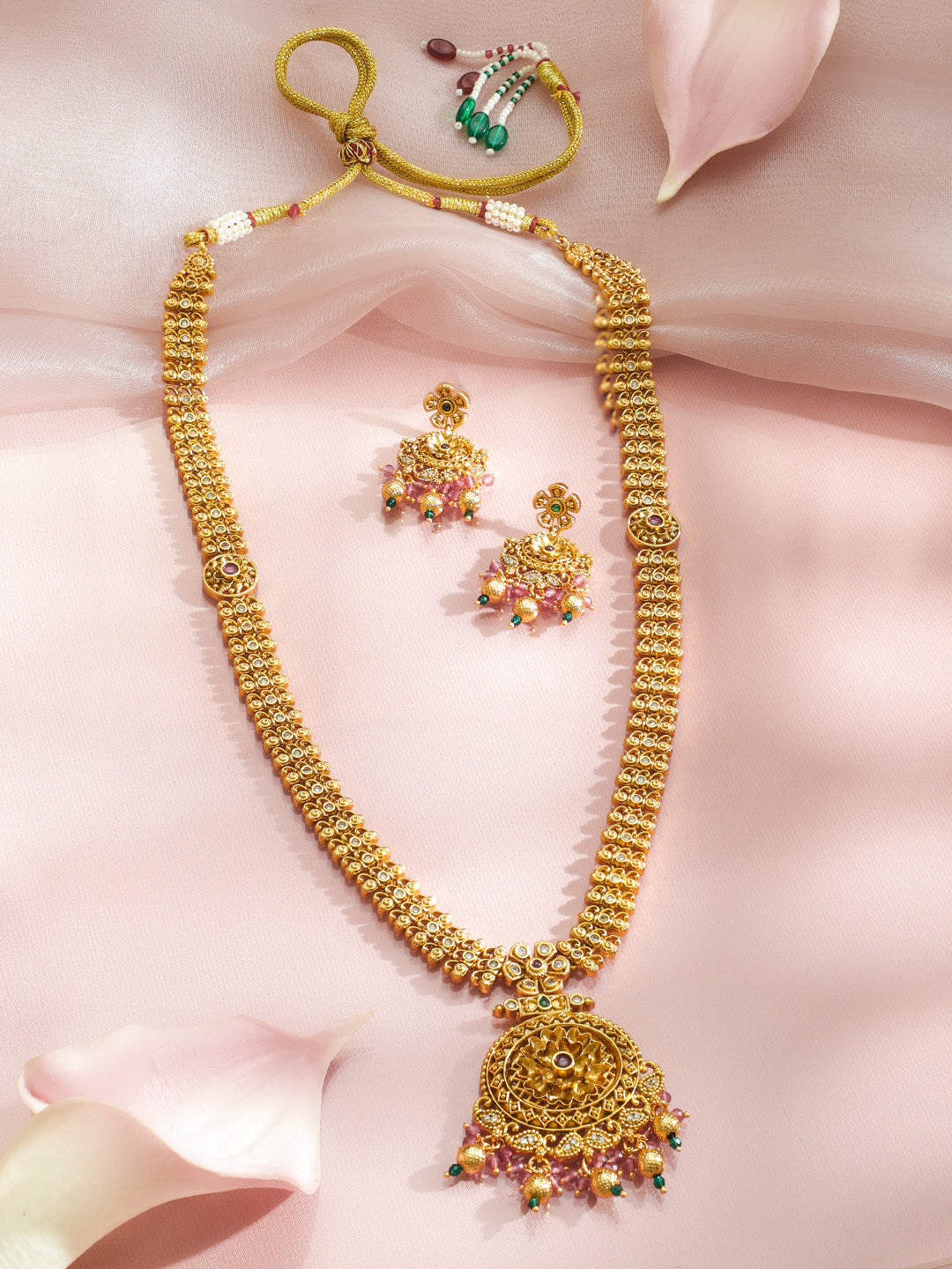 Necklace Set : Rubans 22K gold-plated brass long necklace set, adorned with ruby red and white stones, pastel pink, green, and golden beads, paired with matching earrings—crafted for weddings, parties, and festive occasions.