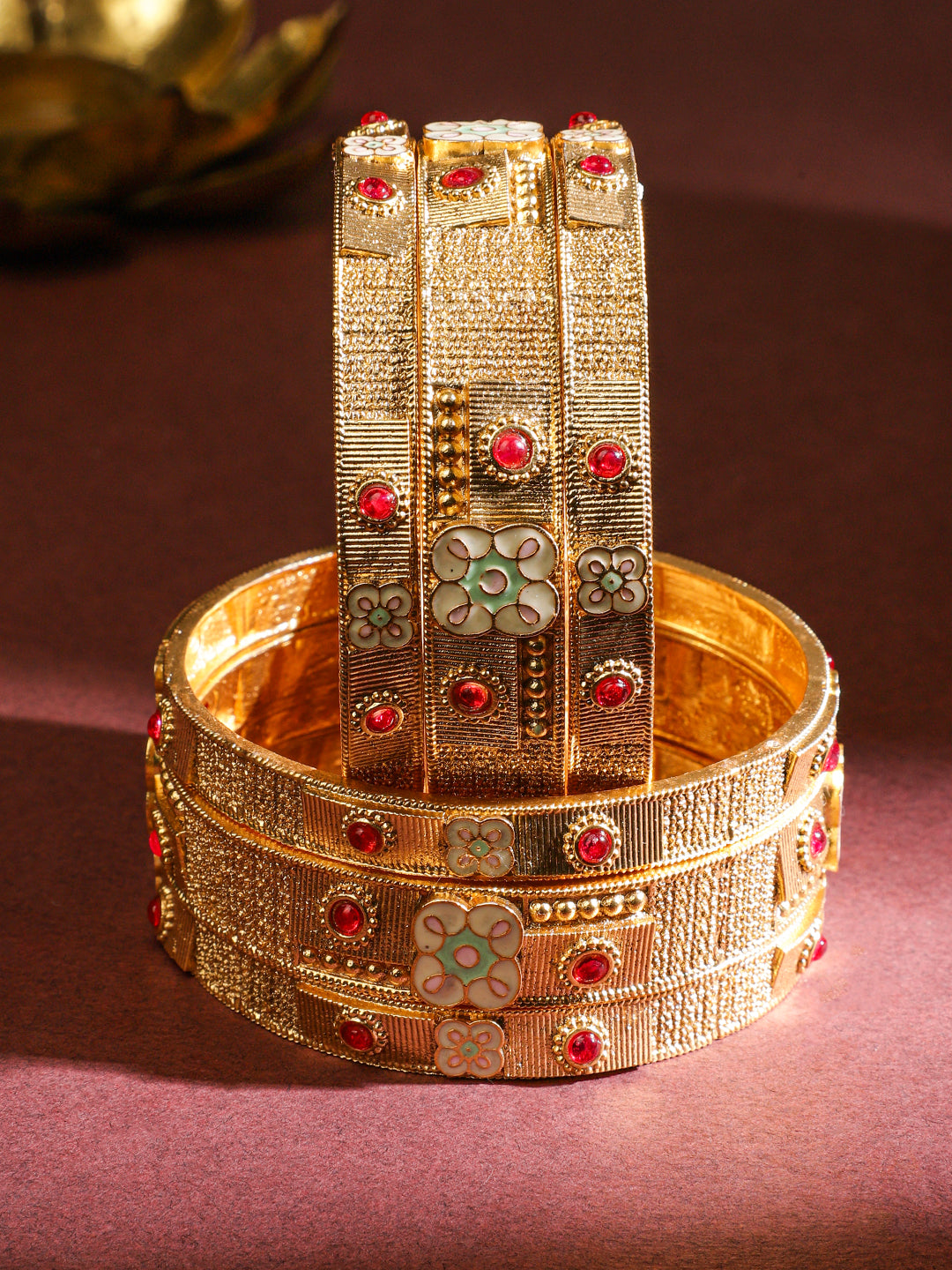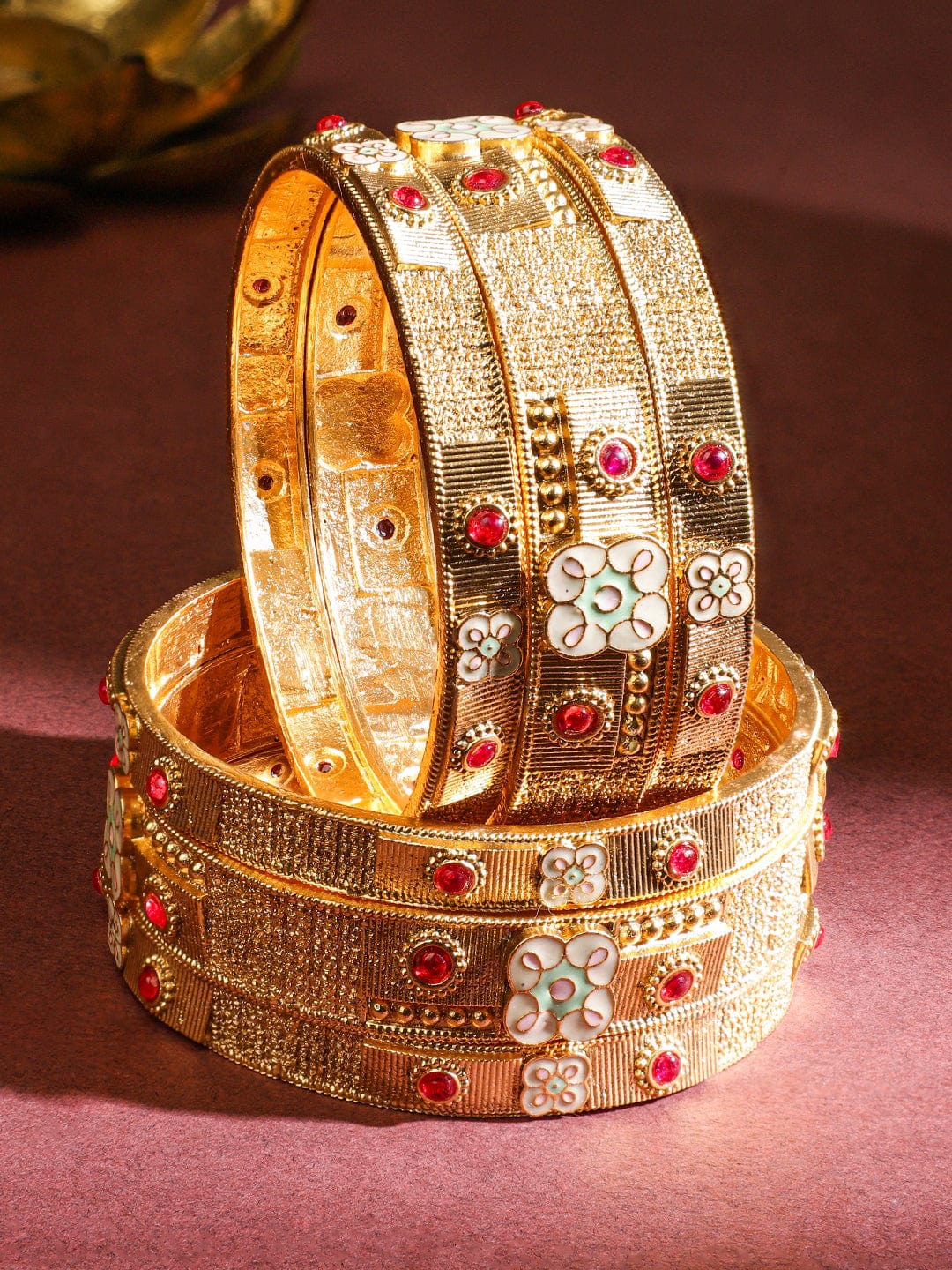 Bangles : Rubans 18K gold-plated set of 6 bangles with ruby red stones and floral enamel motifs offers a regal handcrafted look, perfect for women & girls to wear at weddings, festive occasions and celebrations.