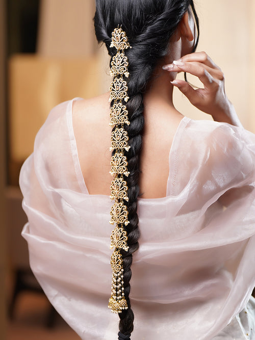Crafted in 22K Gold plated Brass with white Kundan and pearl accents this bridal hair braid accessory offers regal detail and elegant drape perfect for wedding festive and traditional celebrations