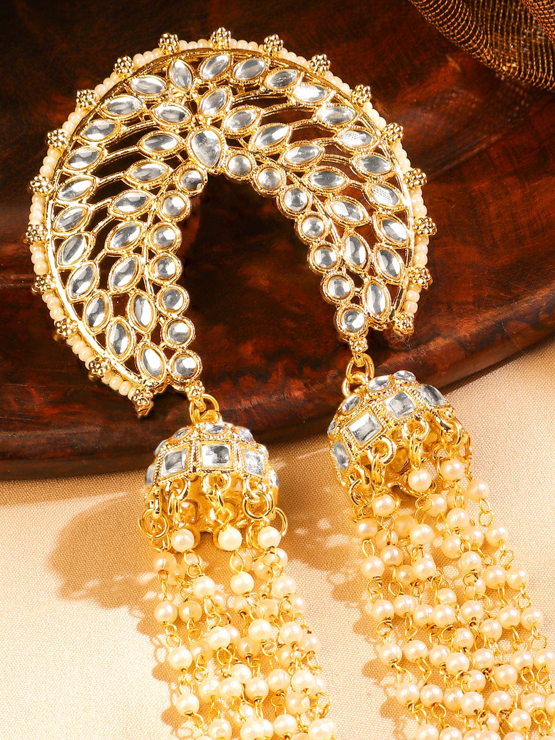 Hair Accessories : Crafted for women, brides, and bridesmaids, this 22K gold-plated hair accessory features a crescent kundan design and multilayer pearl beads—perfect for weddings, sangeet & festive events.