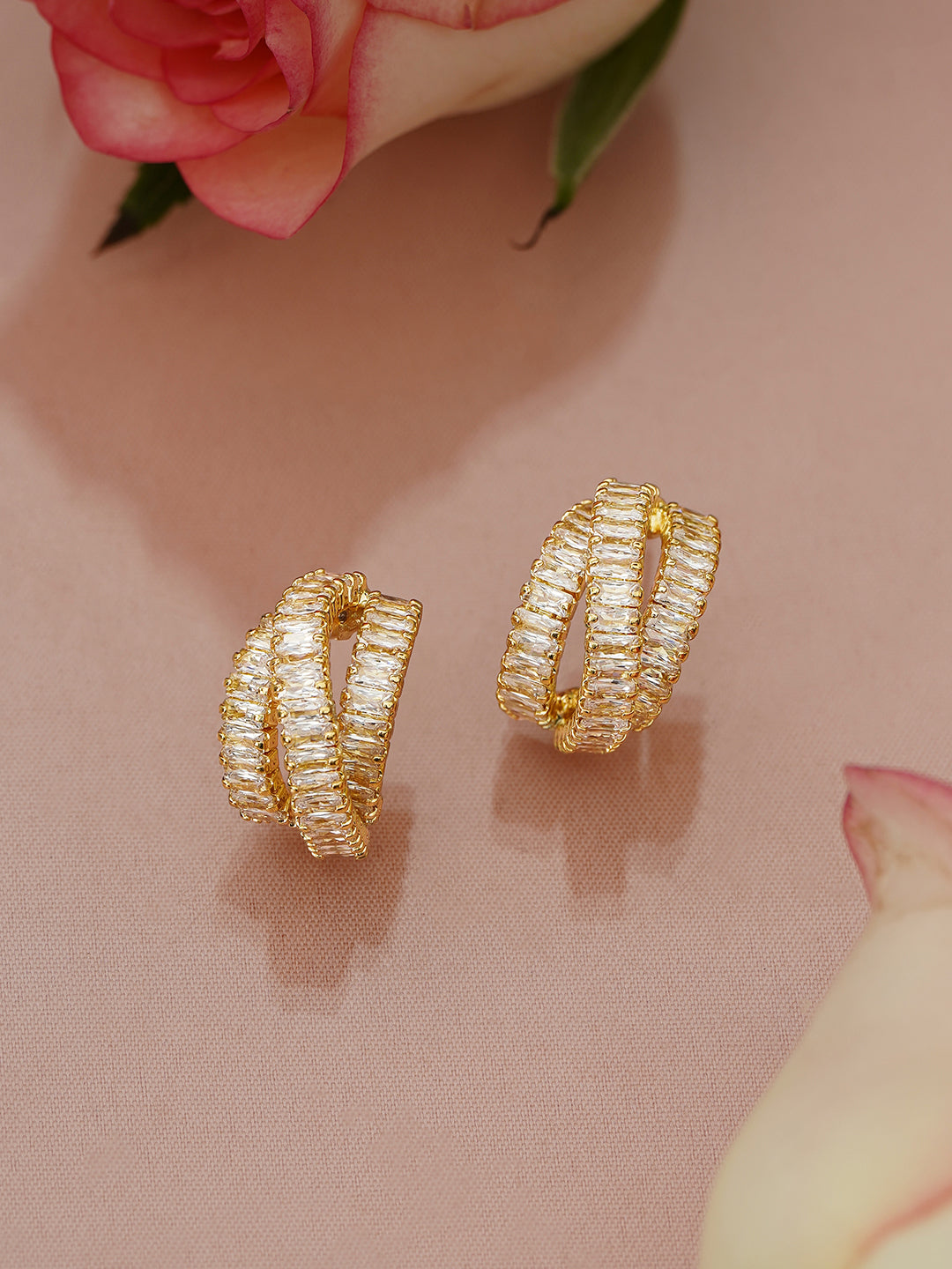 Earrings : Rubans 18K gold-plated brass hoop earrings with white Cubic Zirconia detailing, offering a sleek, minimalist design perfect for daily, office, and casual wear with lasting elegance.