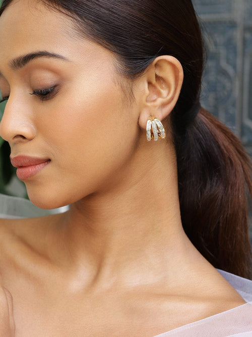 Earrings : Elevate your style with these 18K gold-plated hoop earrings featuring a stunning triple-band design adorned with cubic zirconia detailing for a radiant and elegant look.