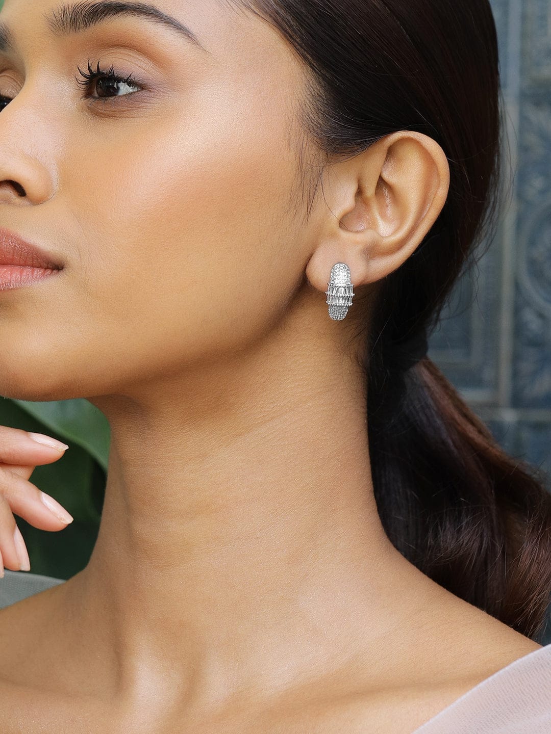Rubans Rhodium-Plated Cubic Zirconia Studded Statement Mini Hoop Earrings Earrings