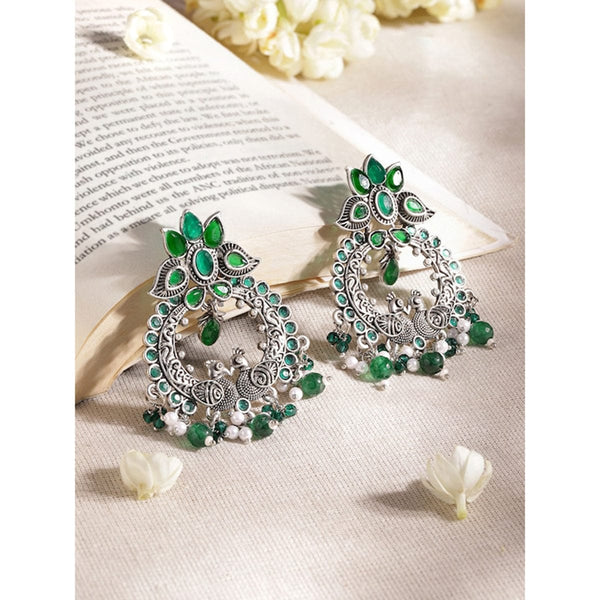 Earrings : These exquisite earrings feature intricately designed oxidized silver adorned with rich emerald green stones and lustrous pearl beads, creating a statement accessory that exudes sophistication. Elevate your look with these unique and eye-catching earrings, perfect for adding a touch of timeless allure to any ensemble. Embrace the fusion of tradition and modernity with this exquisite piece.