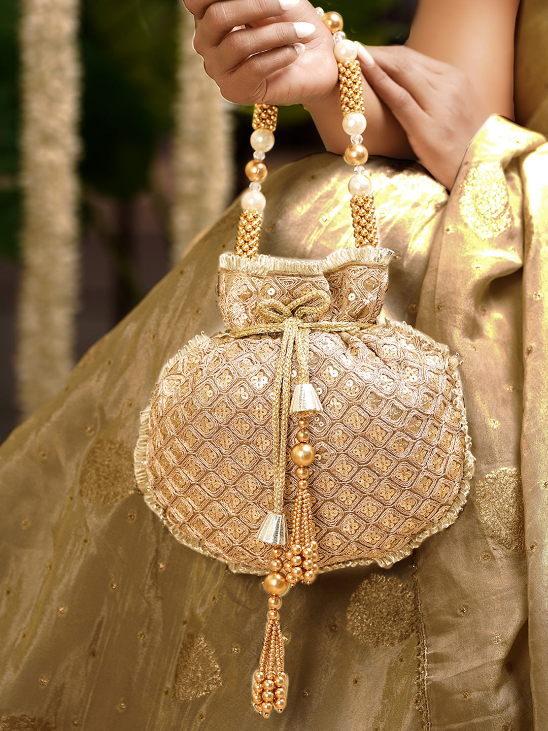 - Bridal Potli Design Golden beige embroidered potli bag adds rich ethnic charm for wedding festive and traditional looks