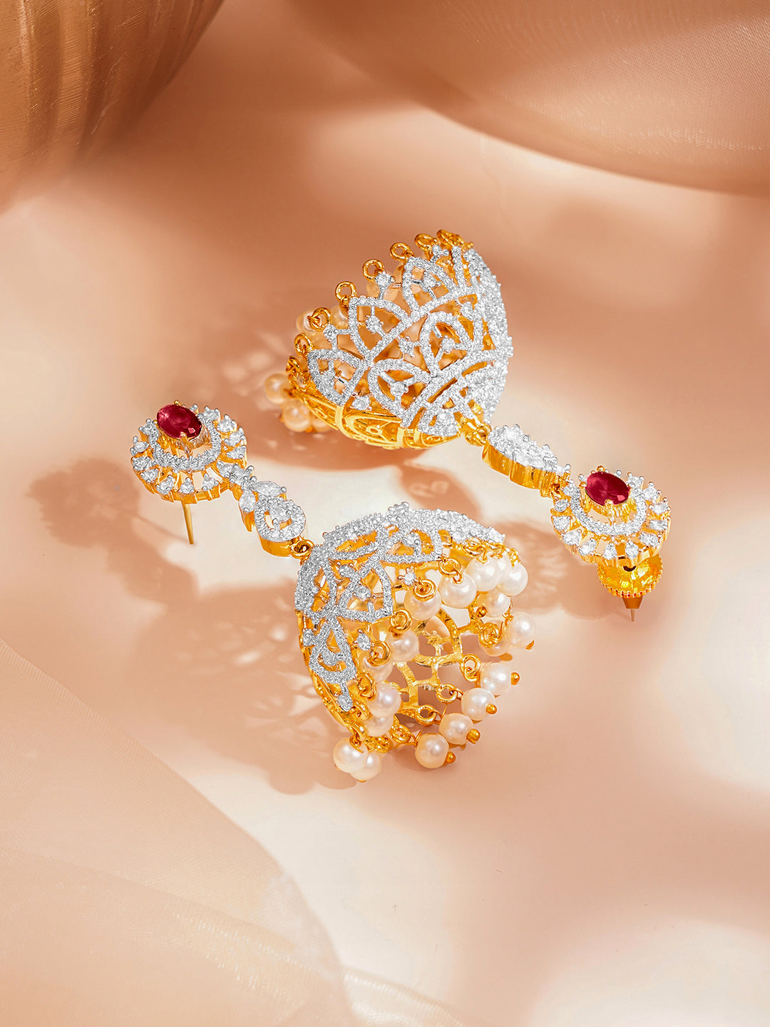 - • Traditional jhumka design highlighted with ruby and Cubic Zirconia detailing finished with graceful pearl drops