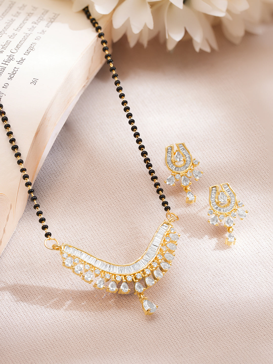 Crafted in gold plated brass, this mangalsutra set features a curved crescent American Diamond pendant with baguette detailing and pear cut drops, paired with a single line black beaded chain and matching stud earrings.