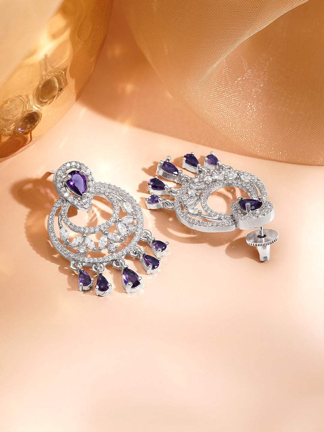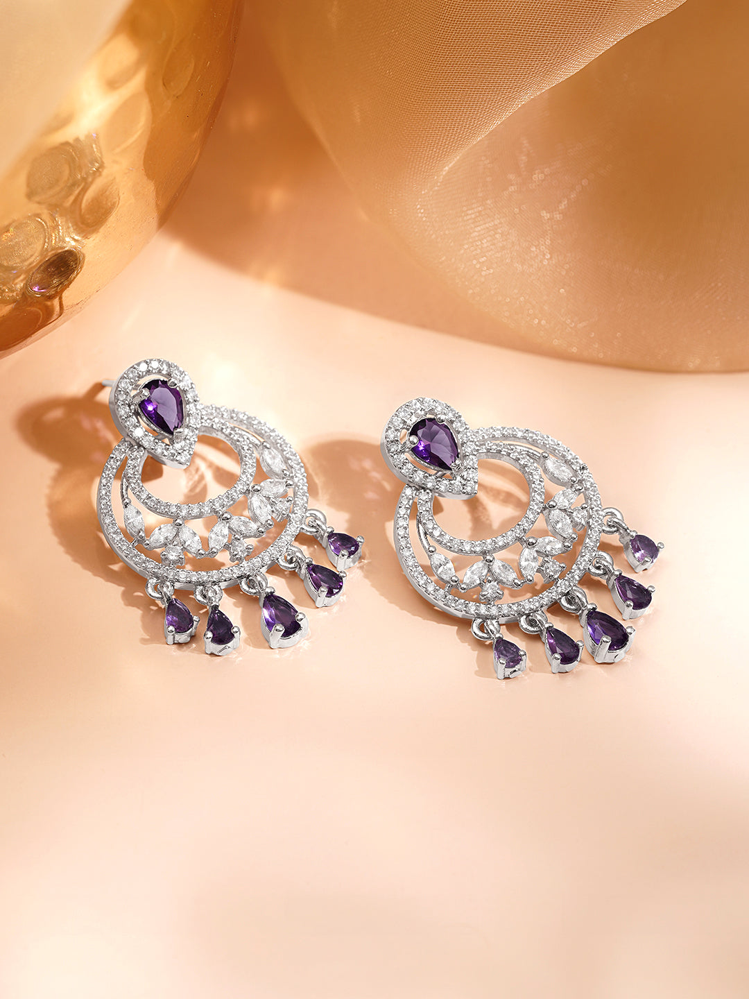 Chandelier earrings crafted in Brass with rhodium plating featuring purple Cubic Zirconia detailing designed for wedding festive and bridal looks making them an elegant gift jewellery choice for women.