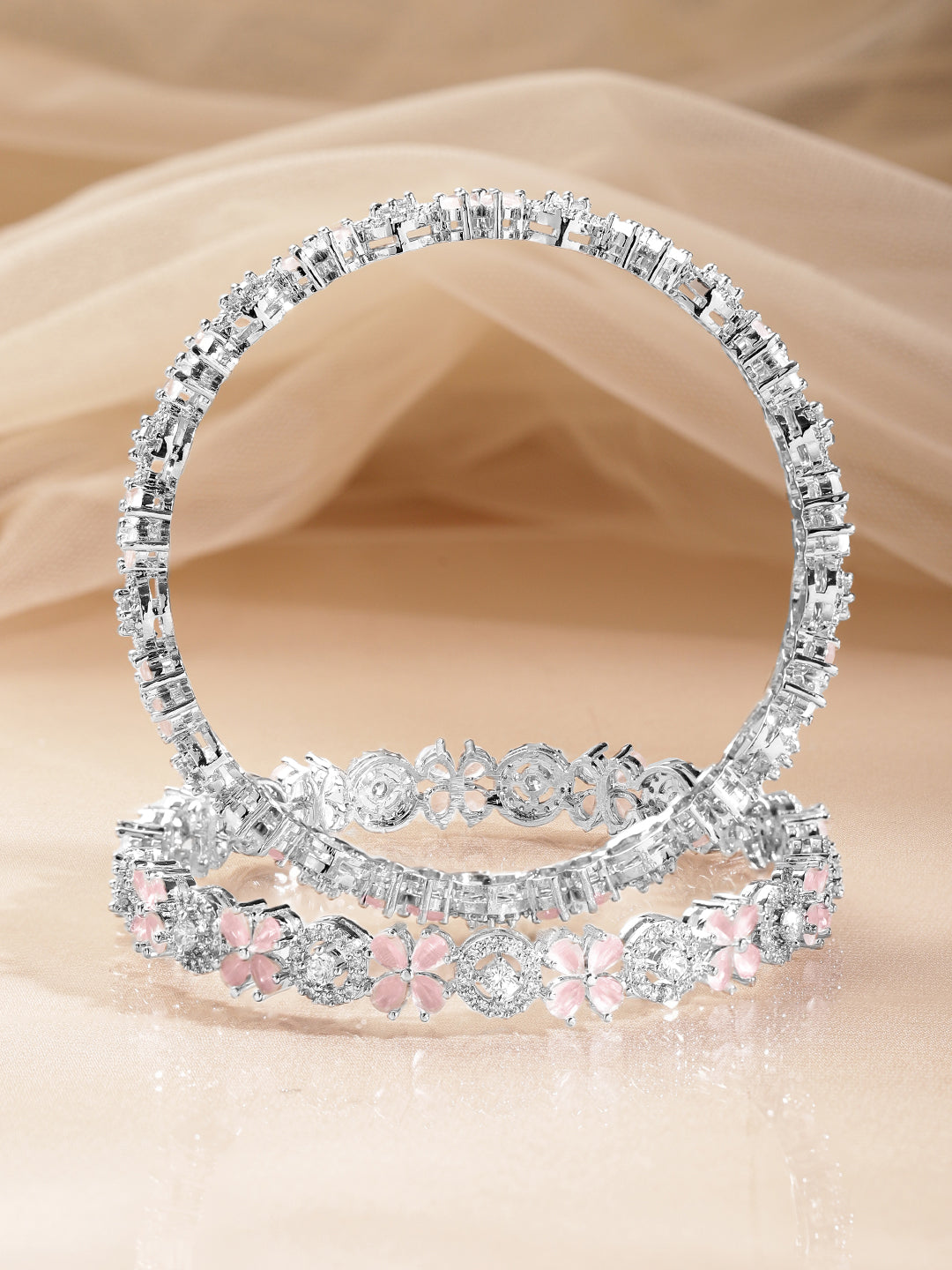 Add graceful sparkle to your jewellery collection with this Rubans rhodium plated bangle set featuring pastel pink American Diamond accents paired with shimmering Cubic Zirconia in a mini floral cluster design. The elegant circular structure creates radiant brilliance, making these bangles perfect for festive celebrations, wedding styling and memorable gifting jewellery for women and girls.