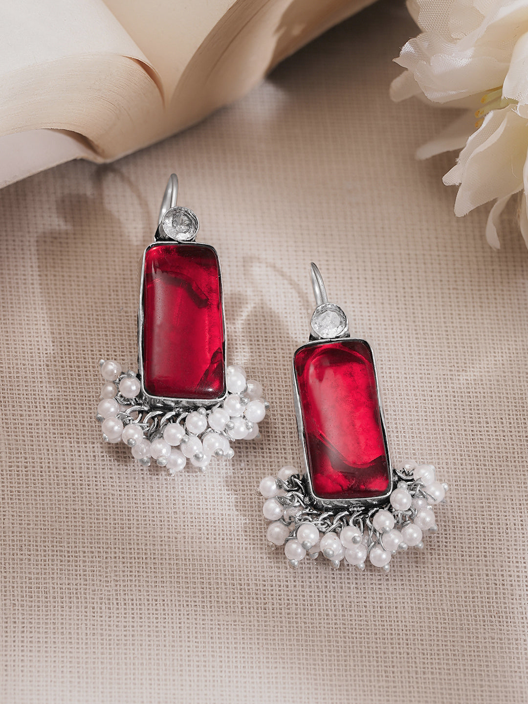 Rubans oxidised silver plated Brass rectangular drop earrings featuring ruby red glass detailing with a soft pearl fringe finish adding subtle sparkle perfect for festive evenings weddings and elegant styling