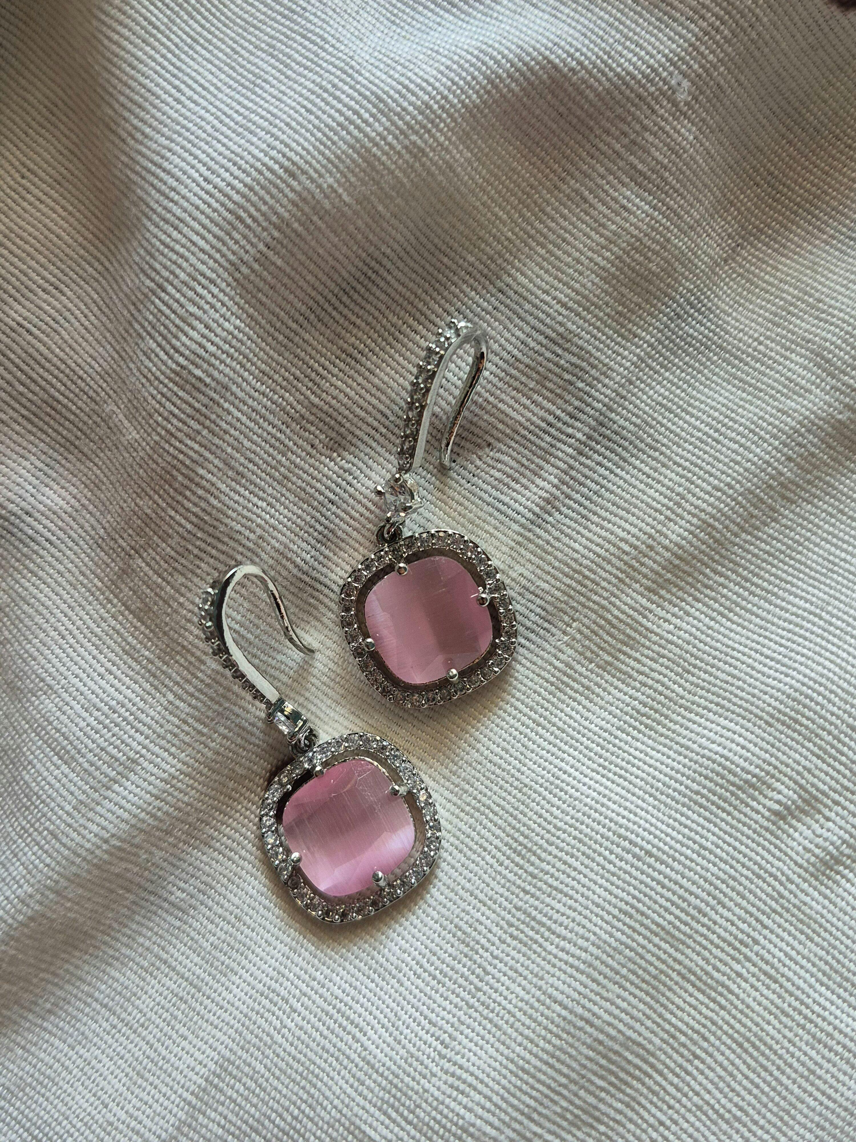 Earrings : Rubans presents these exquisite rhodium-plated drop earrings, featuring soft pastel pink stones in a cushion cut. Framed by dazzling cubic zirconia, these earrings add a touch of elegance and sophistication to any look. The premium design and delicate color make them a versatile addition to your jewelry collection.