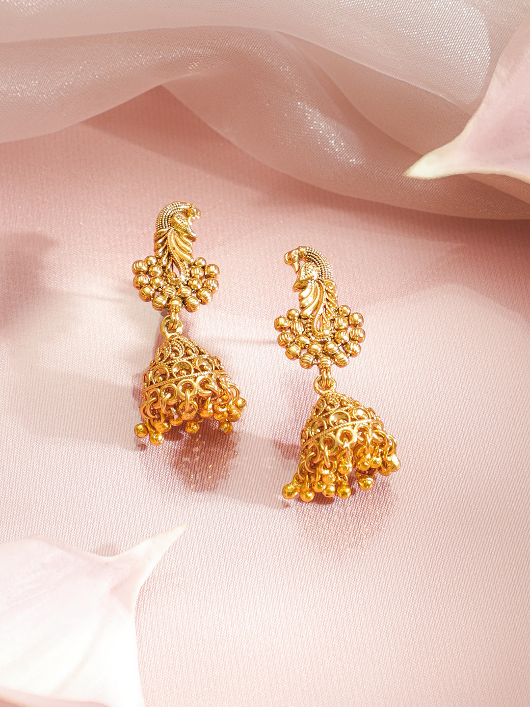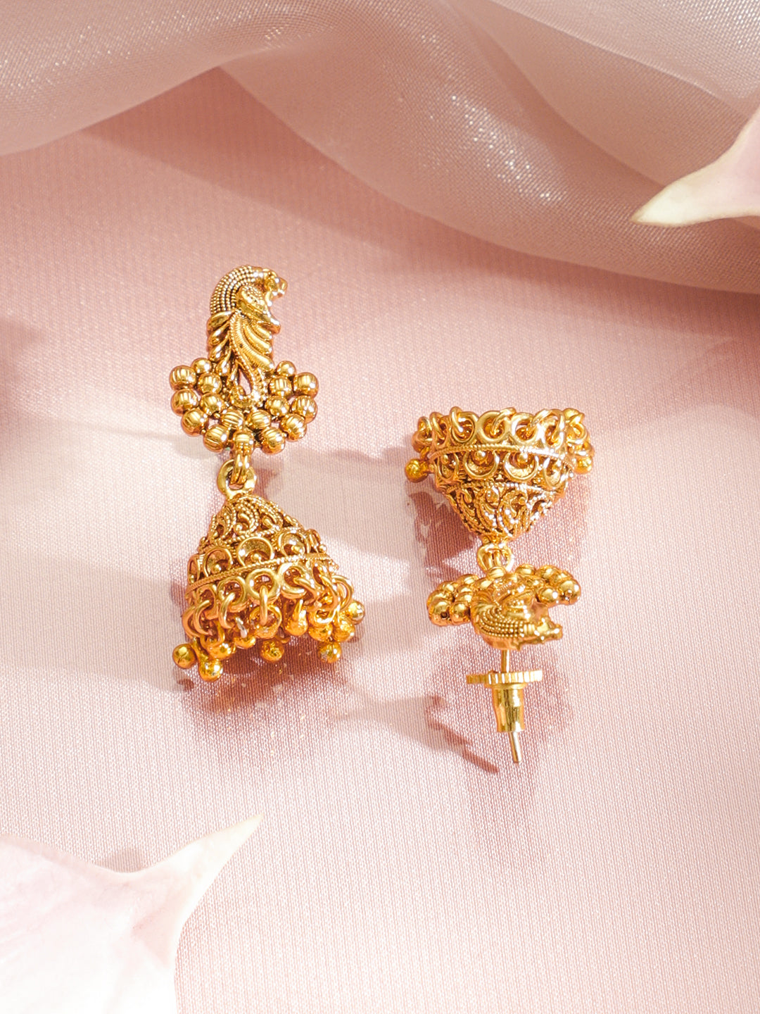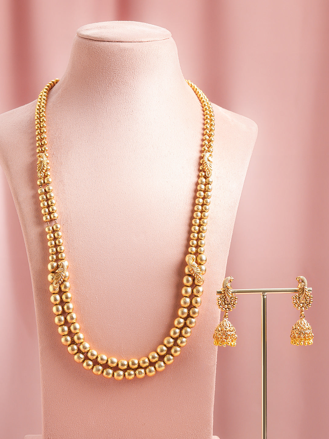 Necklace Set : This 18K gold-plated copper two-layer necklace set features textured golden beads with peacock motifs and matching jhumkas, adding a regal glow to festive and wedding looks.