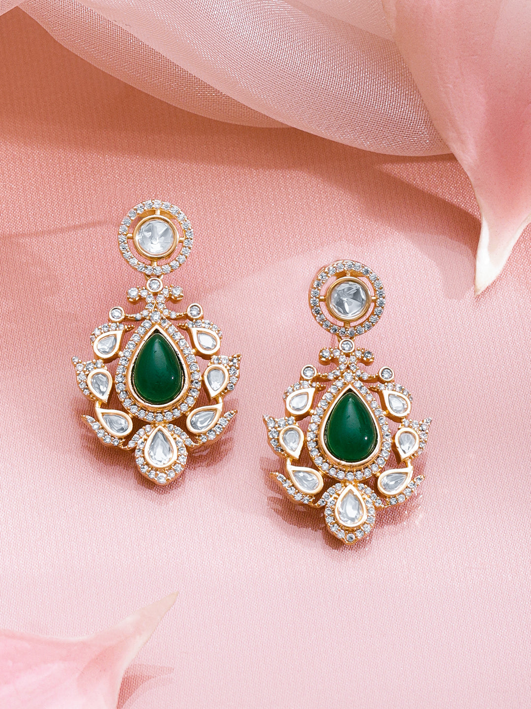 Necklace Set : Rubans 22K gold-plated brass necklace set with white Kundan, Cubic Zirconia, and emerald green stones. Includes matching earrings, perfect for weddings, parties and festive occasions.