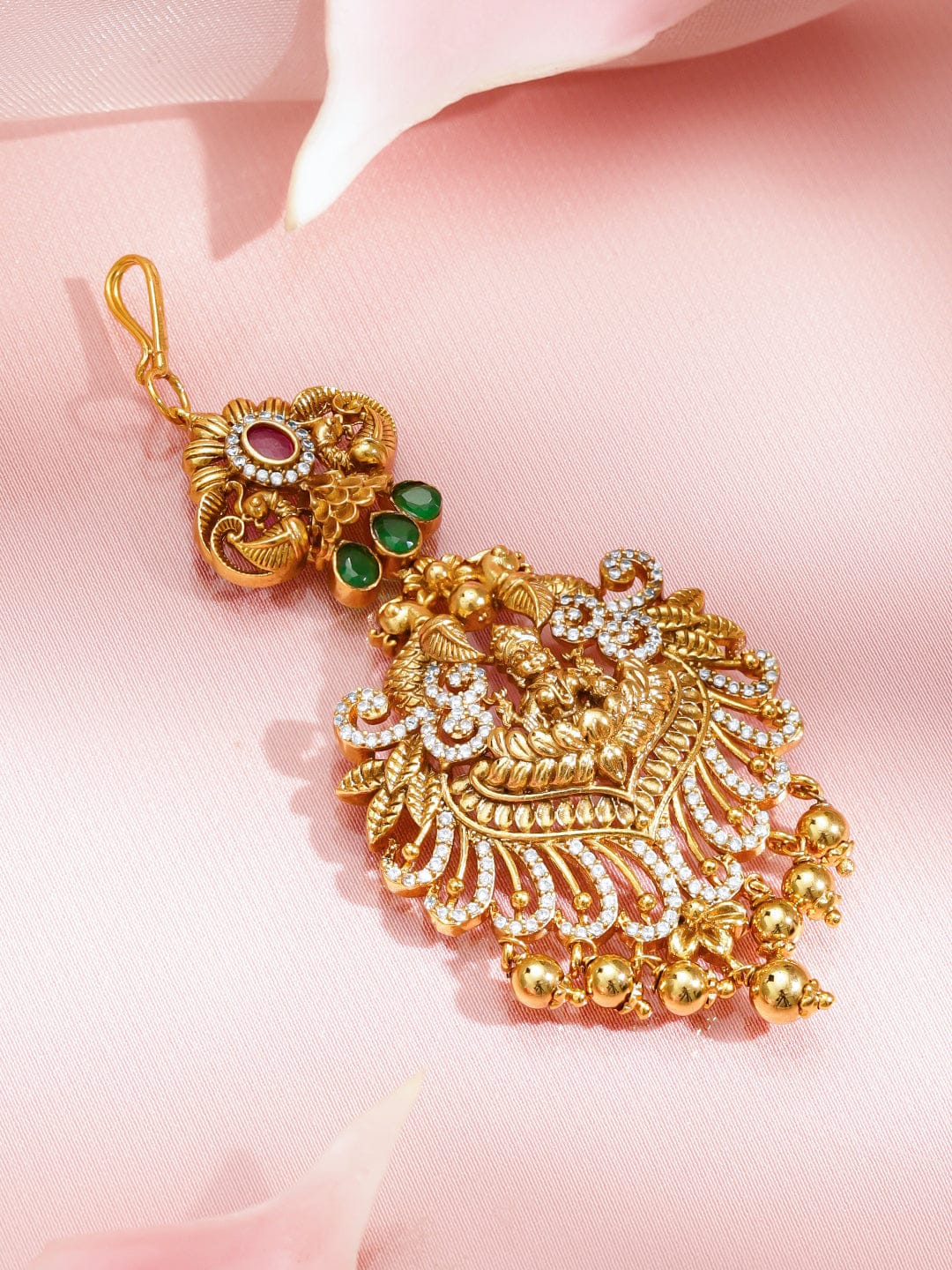 Maang Tikka : A 22K gold-plated temple-style maang tikka featuring goddess Lakshmi, ruby red & emerald green Cubic Zirconia, shimmering white CZ accents, and golden bead danglings. Perfect for weddings & festivals.