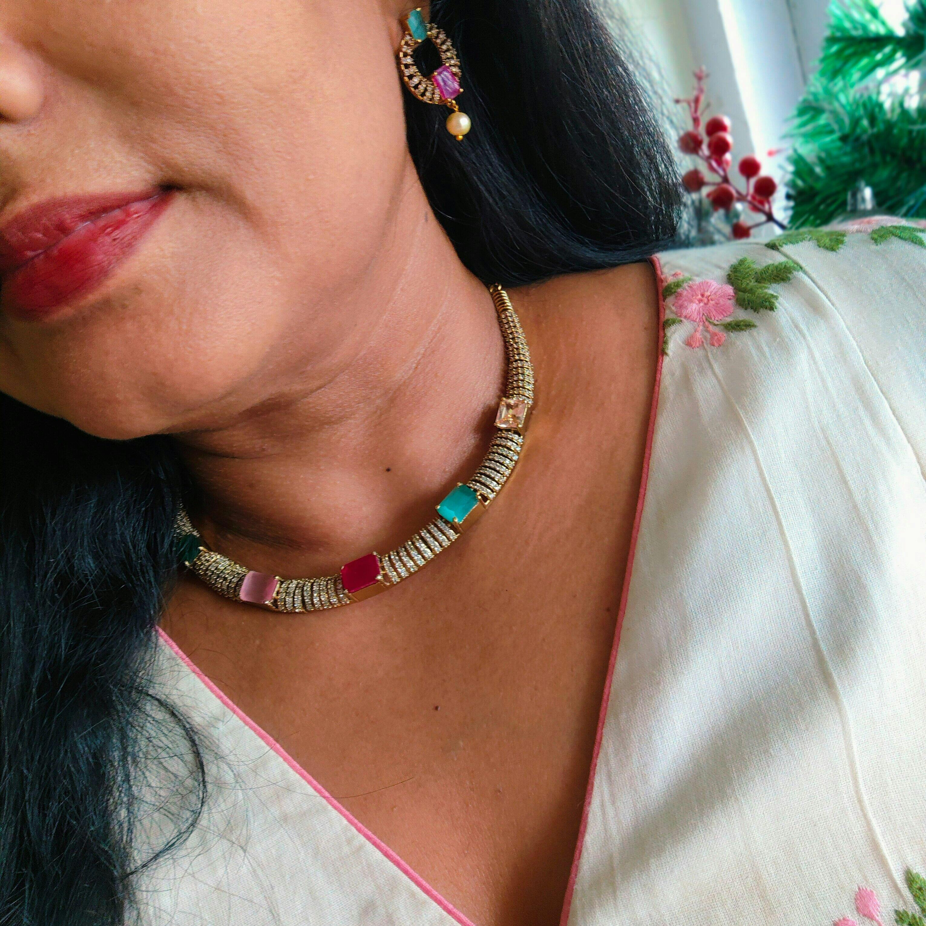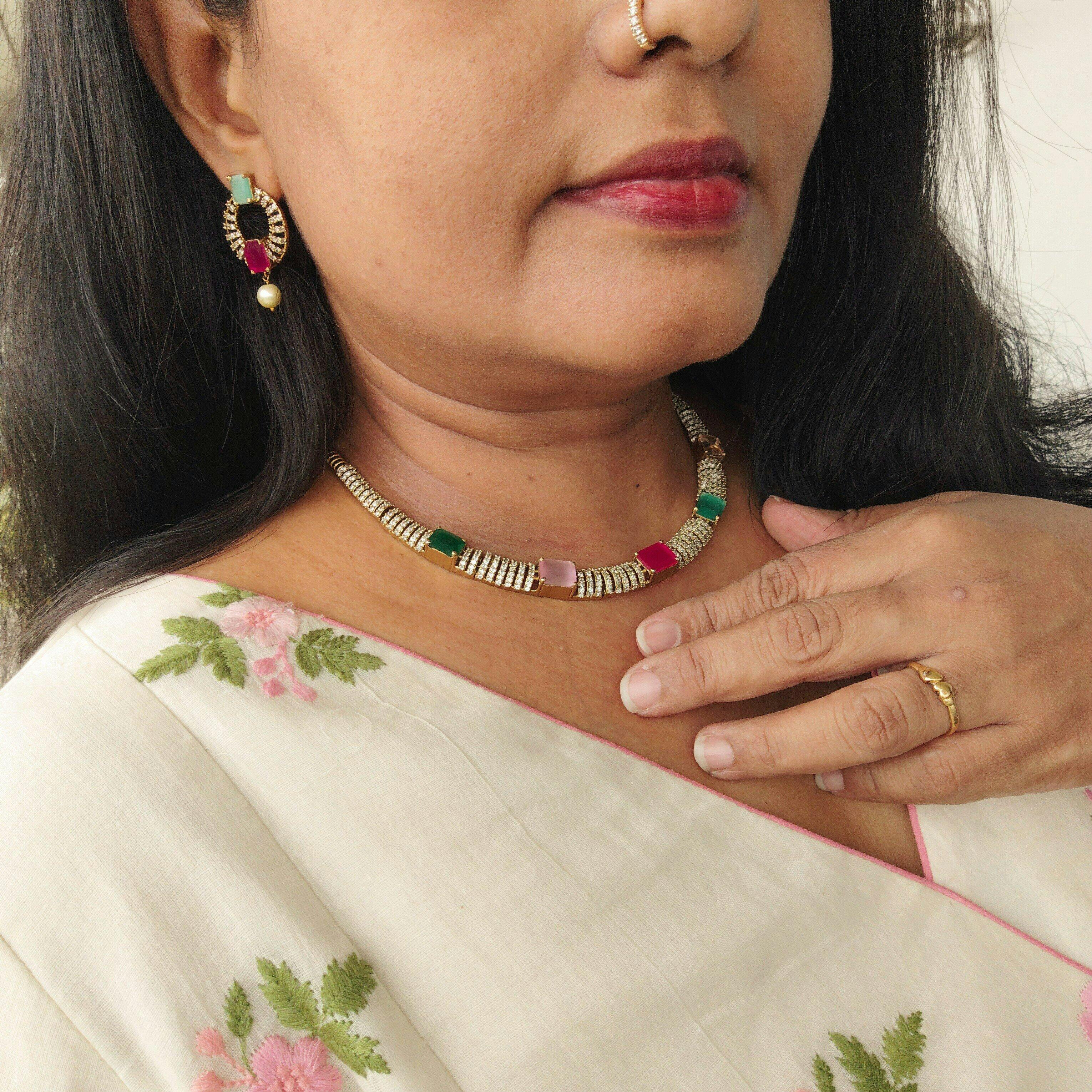 Elevate your style with this exquisite gold-plated AD necklace set. Crafted with precision and adorned with sparkling stones, this set adds a touch of luxury to any outfit.