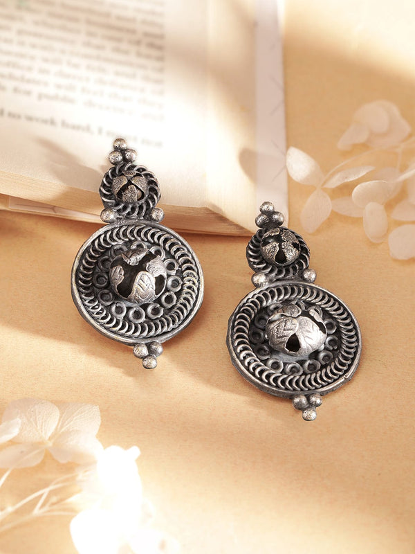 Rubans Silver-Toned Circular Oxidized Traditional Self Engraved Studs Earrings