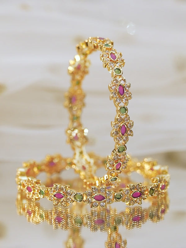 Enhance your grace with this set of 2 handcrafted 22K gold-plated bangles, adorned with ruby pink and emerald green stones, and sparkling cubic zirconia accents for a regal look.