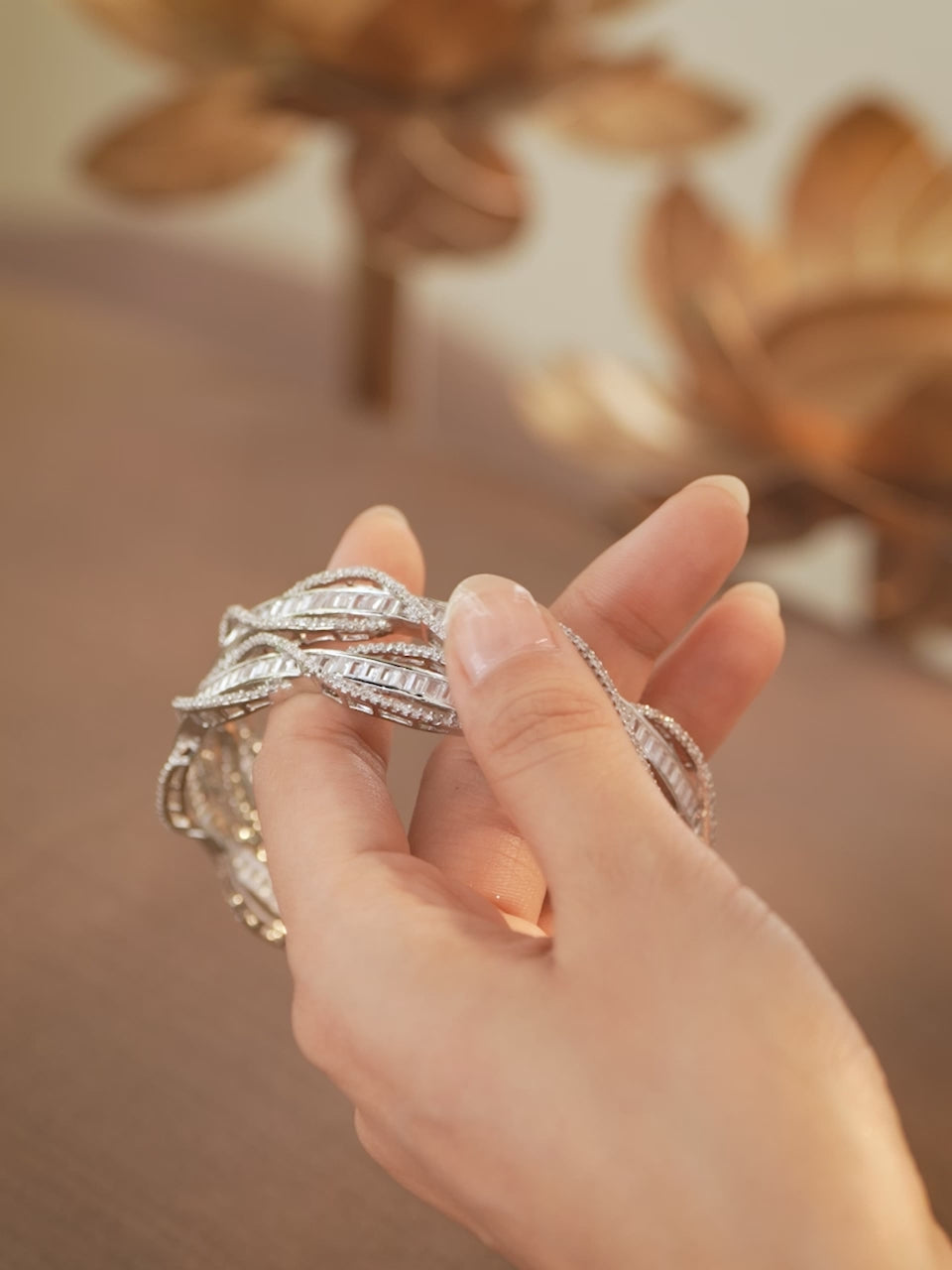 Bangle : Exquisite rhodium-plated premium bangles featuring a unique twisted design with dazzling cubic zirconia stones, perfect for an elegant touch to your attire.
