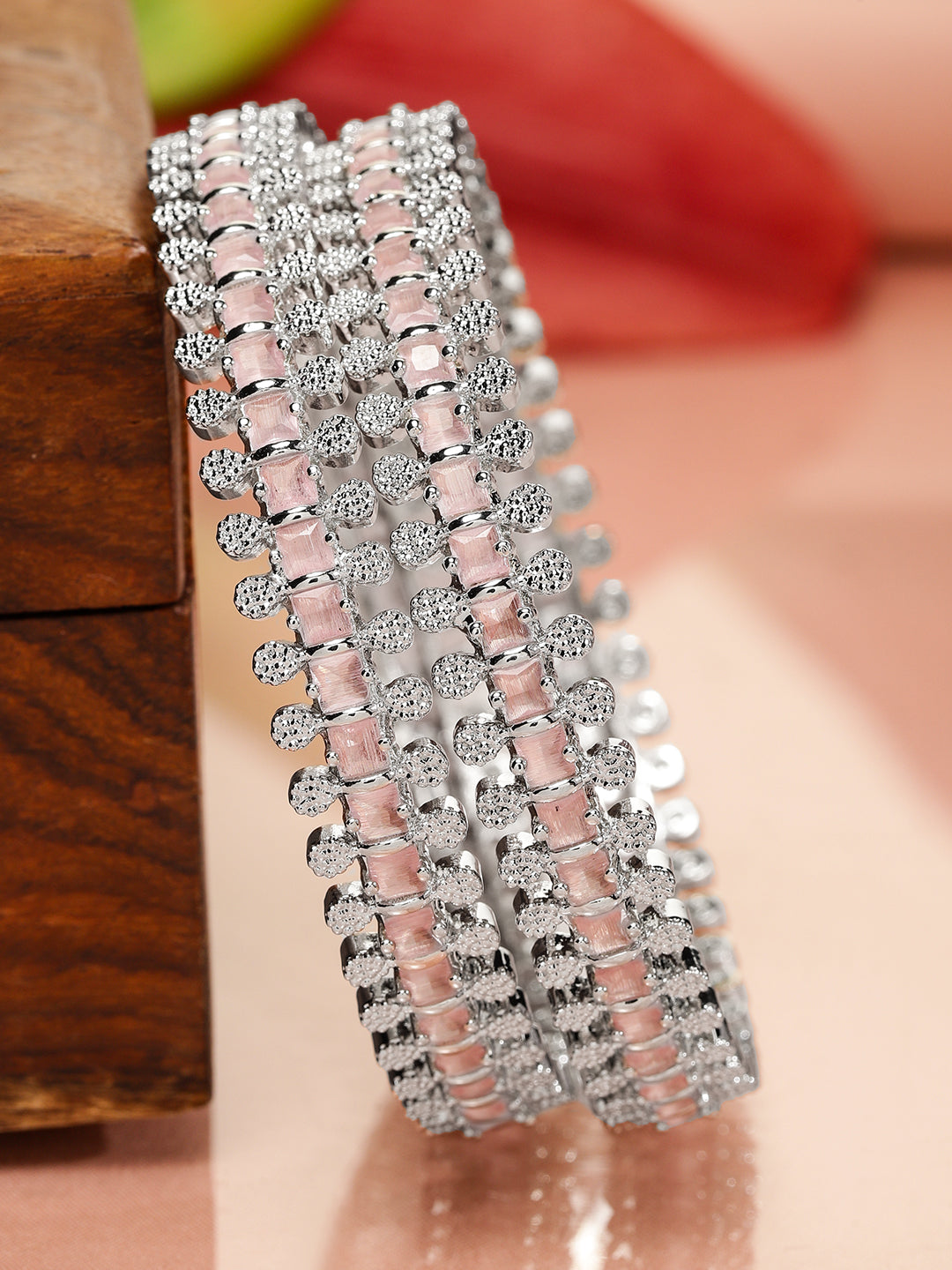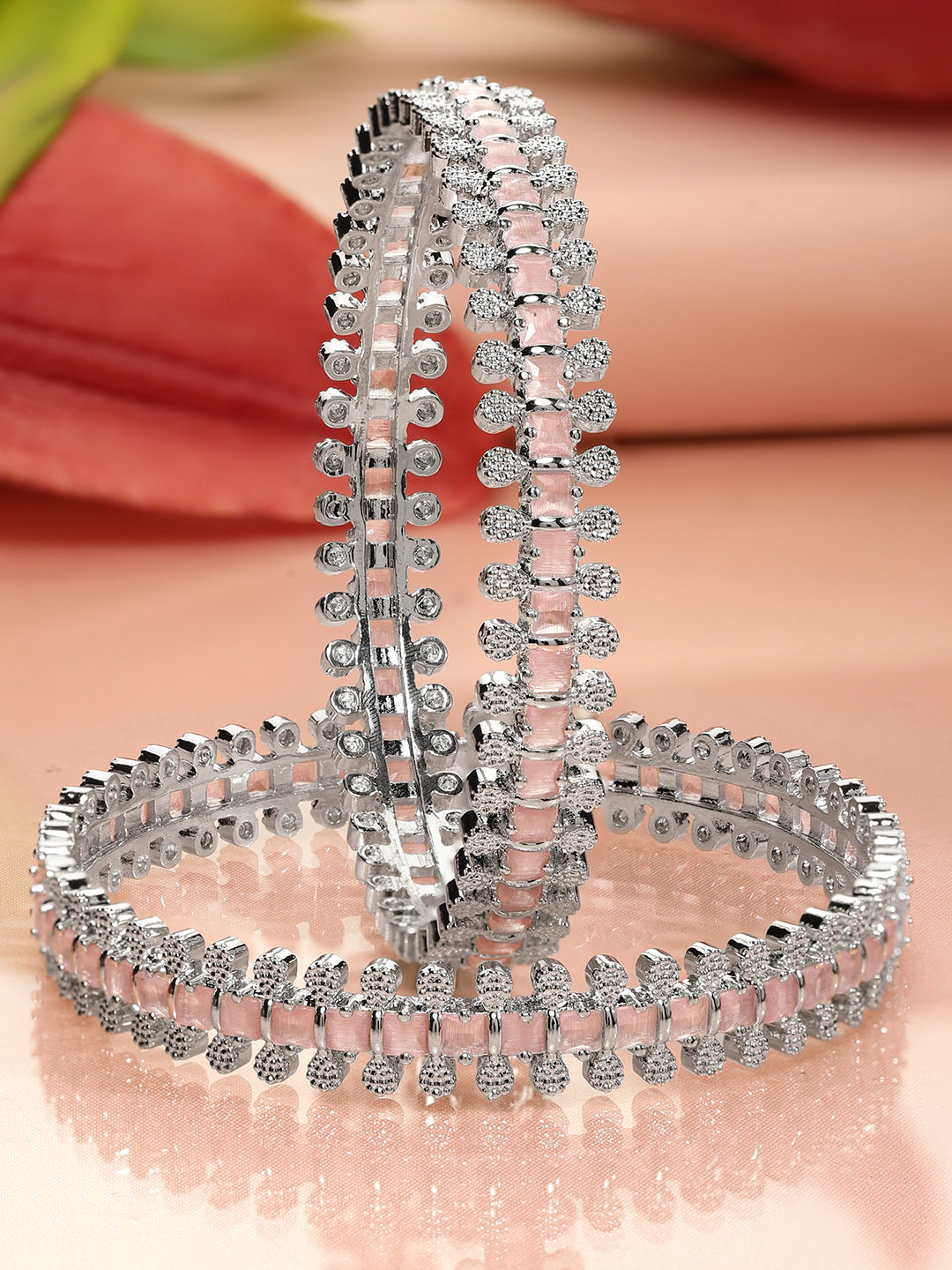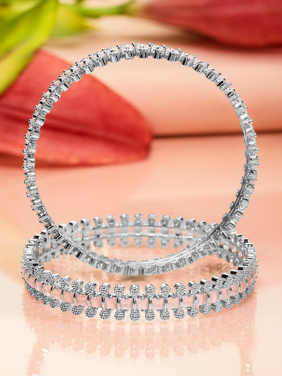 Bangle : A luxurious set of 2 rhodium-plated bangles, adorned with pastel pink and white cubic zirconia. The delicate hues and radiant sparkle make these bangles an elegant and timeless statement piece.
