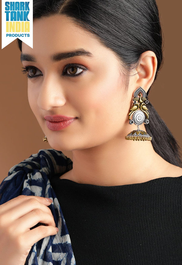 Rubans Silver Plated Handcrafted Oxidised Dual Tone Peacock Shape Jhum