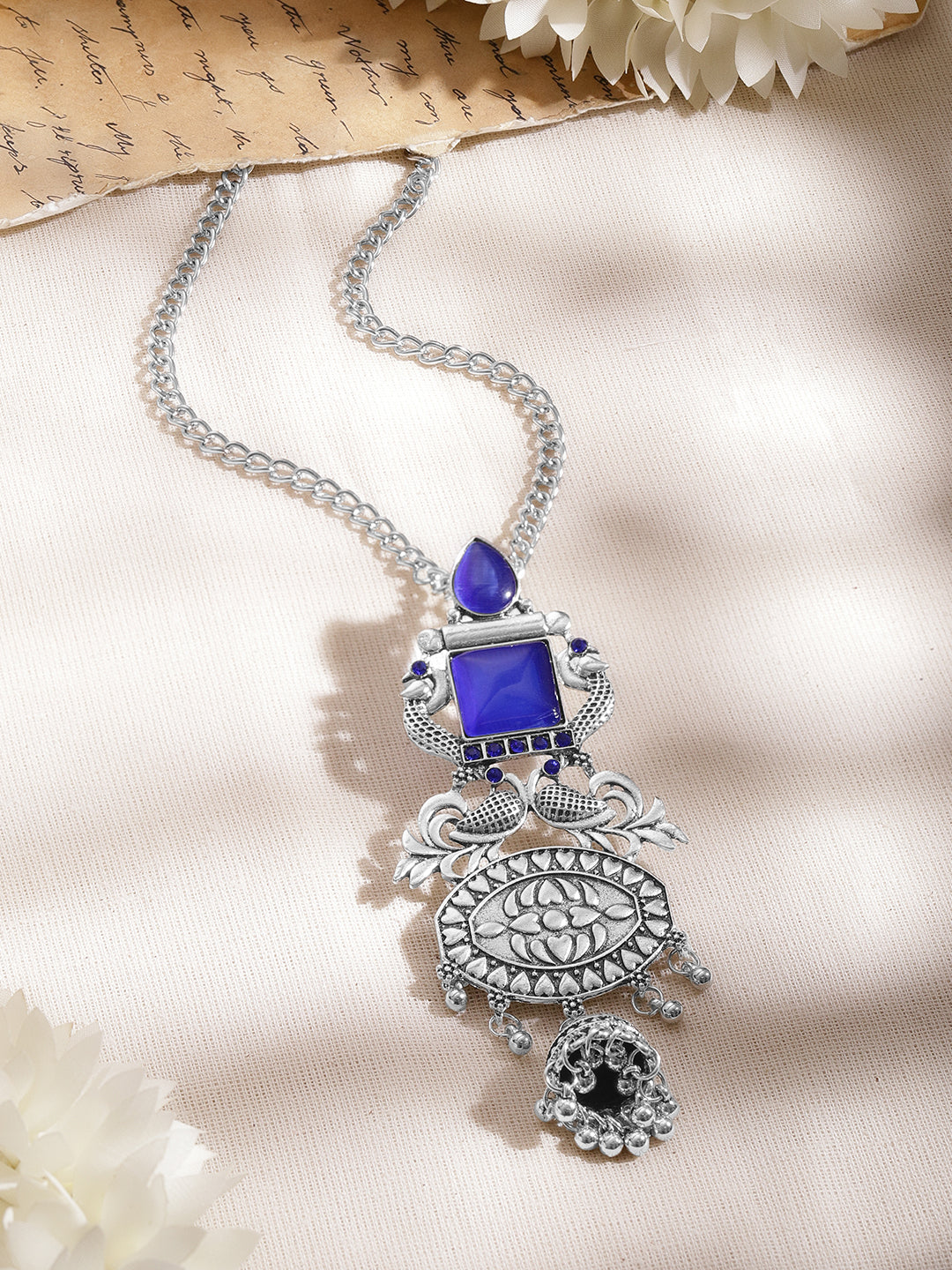 Oxidised Brass long chain necklace with blue enamel detailing, crafted for wedding festive and party styling, ideal gift for women and girls.