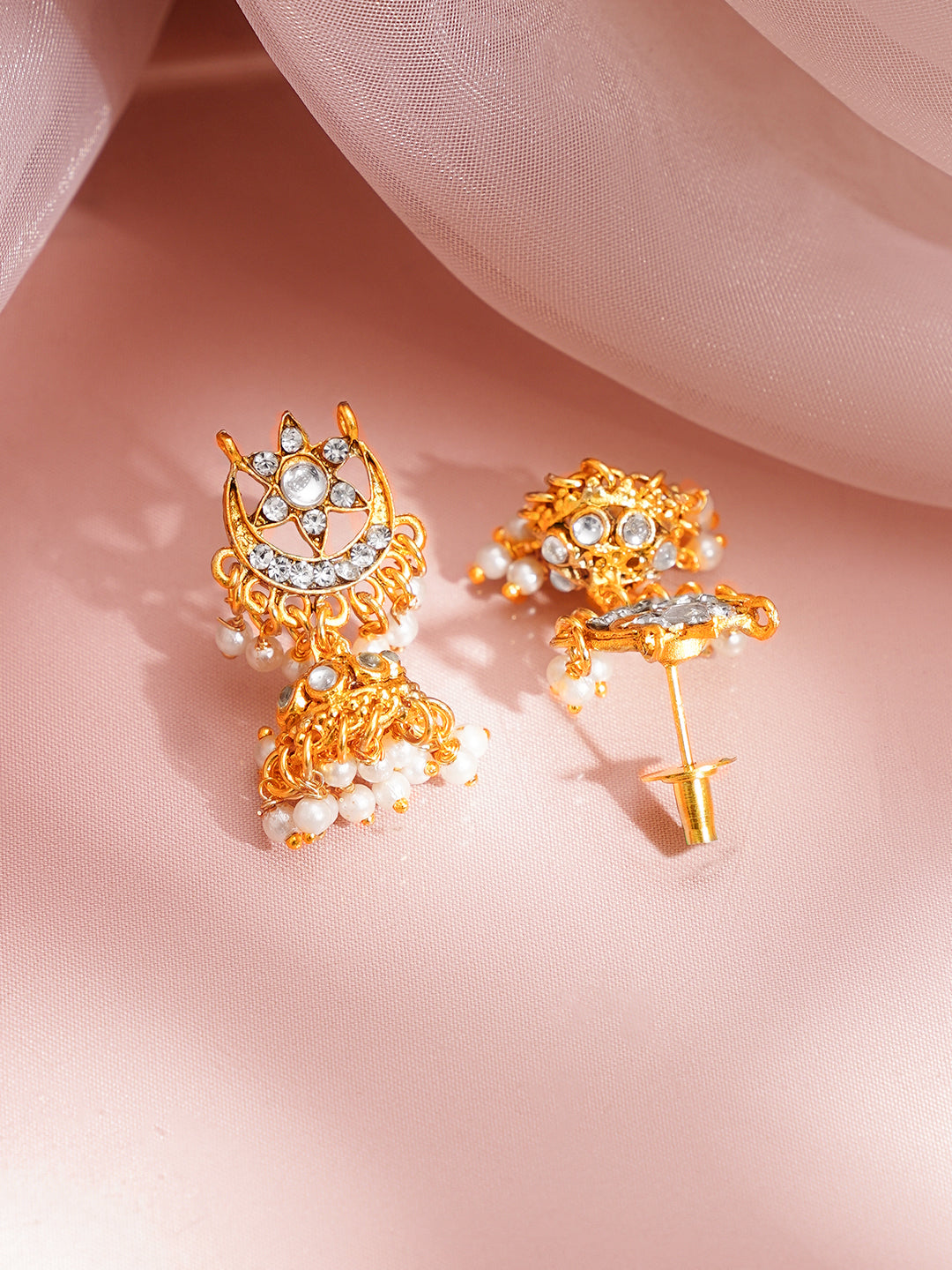 Create a striking festive look with this Rubans 18K gold plated choker necklace set crafted with Kundan detailing and delicate pearl bead accents. The crescent motifs paired with a floral centerpiece create a rich traditional design. Finished with an adjustable dori closure and matching jhumka earrings, it is perfect for wedding styling, celebrations and gifting jewellery for women and girls.