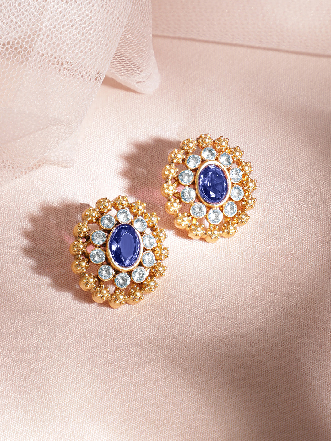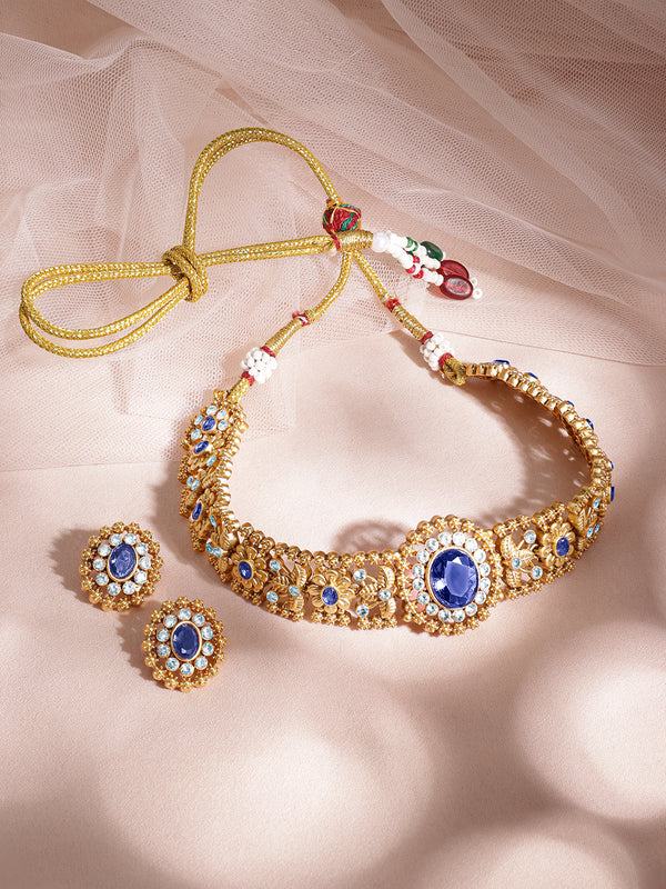 Necklace Set : Elevate your elegance with Rubans' 24K gold-plated handcrafted choker set featuring stunning blue sapphire stones and white cubic zirconia. A perfect blend of luxury and craftsmanship.