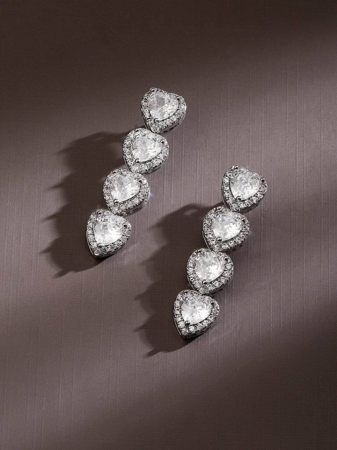 Earrings : Elegantly designed rhodium-plated drop earrings featuring dazzling heart-shaped cubic zirconia stones in a cascading design. These premium earrings exude sophistication and charm, making them a perfect choice for romantic occasions and glamorous evening wear.