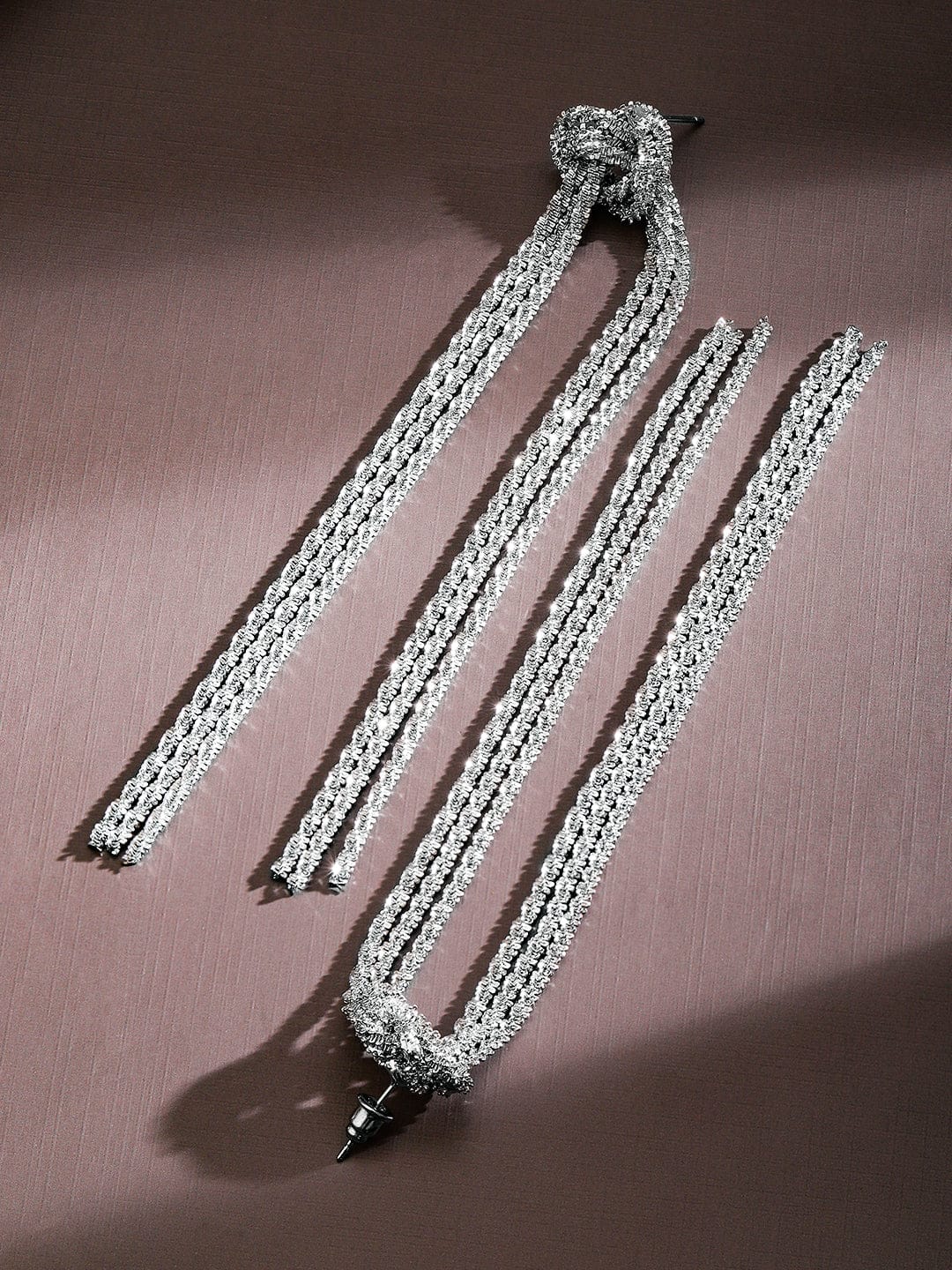 Earrings : Enhance your style with Rubans'silver-plated statement earrings featuring a unique knotted design with cascading long chain details. These versatile earrings exude bold elegance, perfect for any chic ensemble.