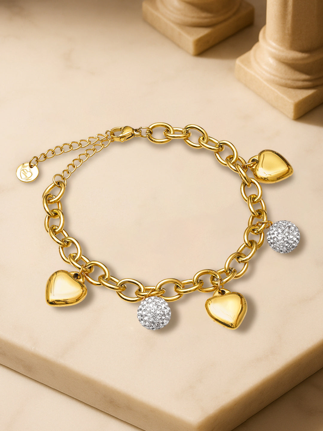 Rubans Voguish 18K gold-plated stainless steel bracelet featuring heart and crystal-studded charms. Tarnish-free, waterproof, and perfect for everyday elegance or party sparkle.