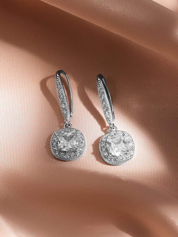 Rubans Rhodium-Plated Cushion Halo Cubic Zirconia Studded Drop Earrings
