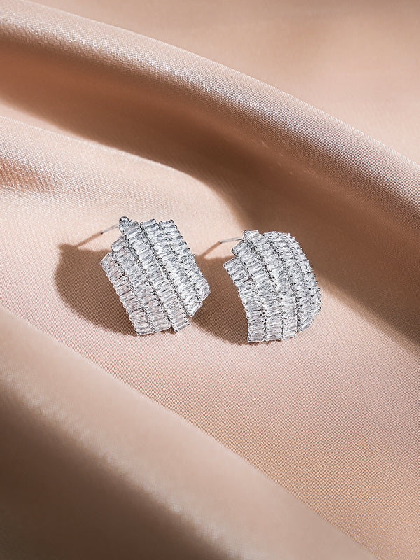 Rhodium-plated curved statement studs embellished with shimmering baguette AD stones, offering a premium sparkle perfect for daily wear, party looks, festive outfits, and elegant wedding styling.