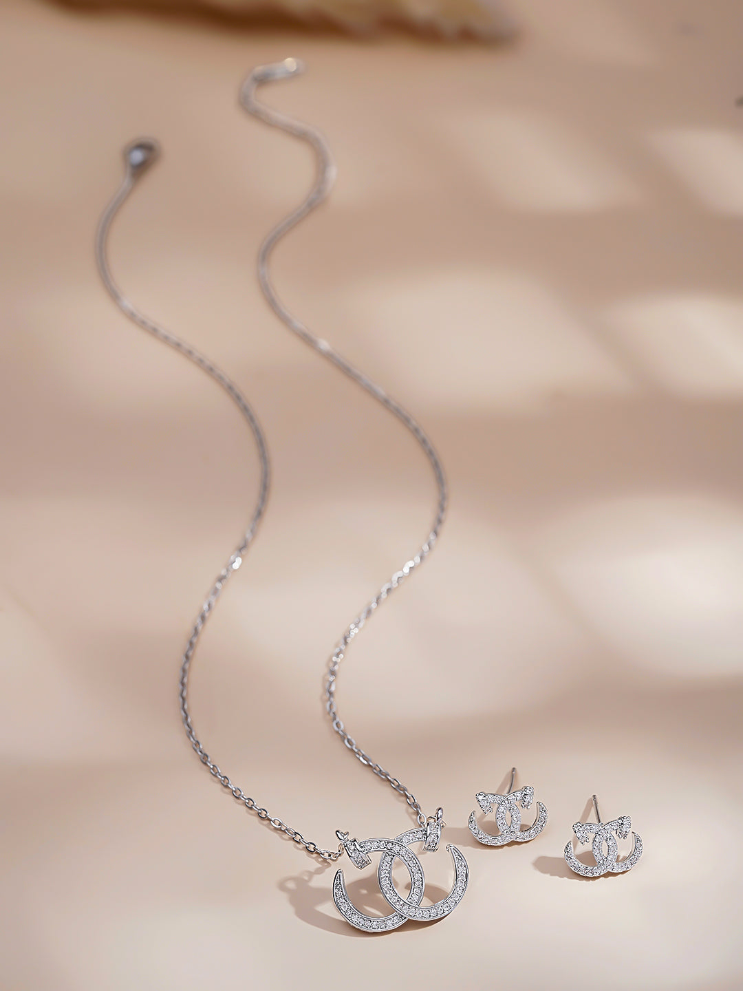 This rhodium-plated interlocked C pendant set features sparkling Cubic Zirconia and a sleek modern silhouette, perfect for daily wear, parties, and elegant minimal styling.