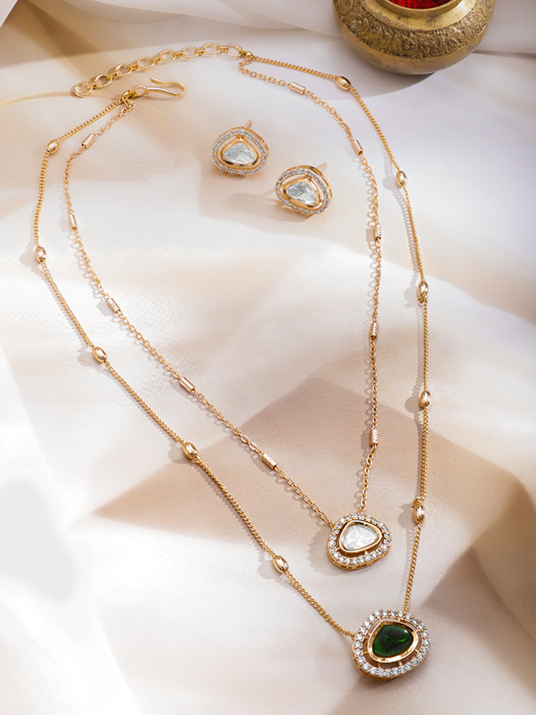 Necklace Set : A 22K gold-plated brass dual-layer necklace set embellished with emerald green kundan and Cubic Zirconia stones, paired with matching studs — a perfect pick for festive, wedding, or elegant daily wear.