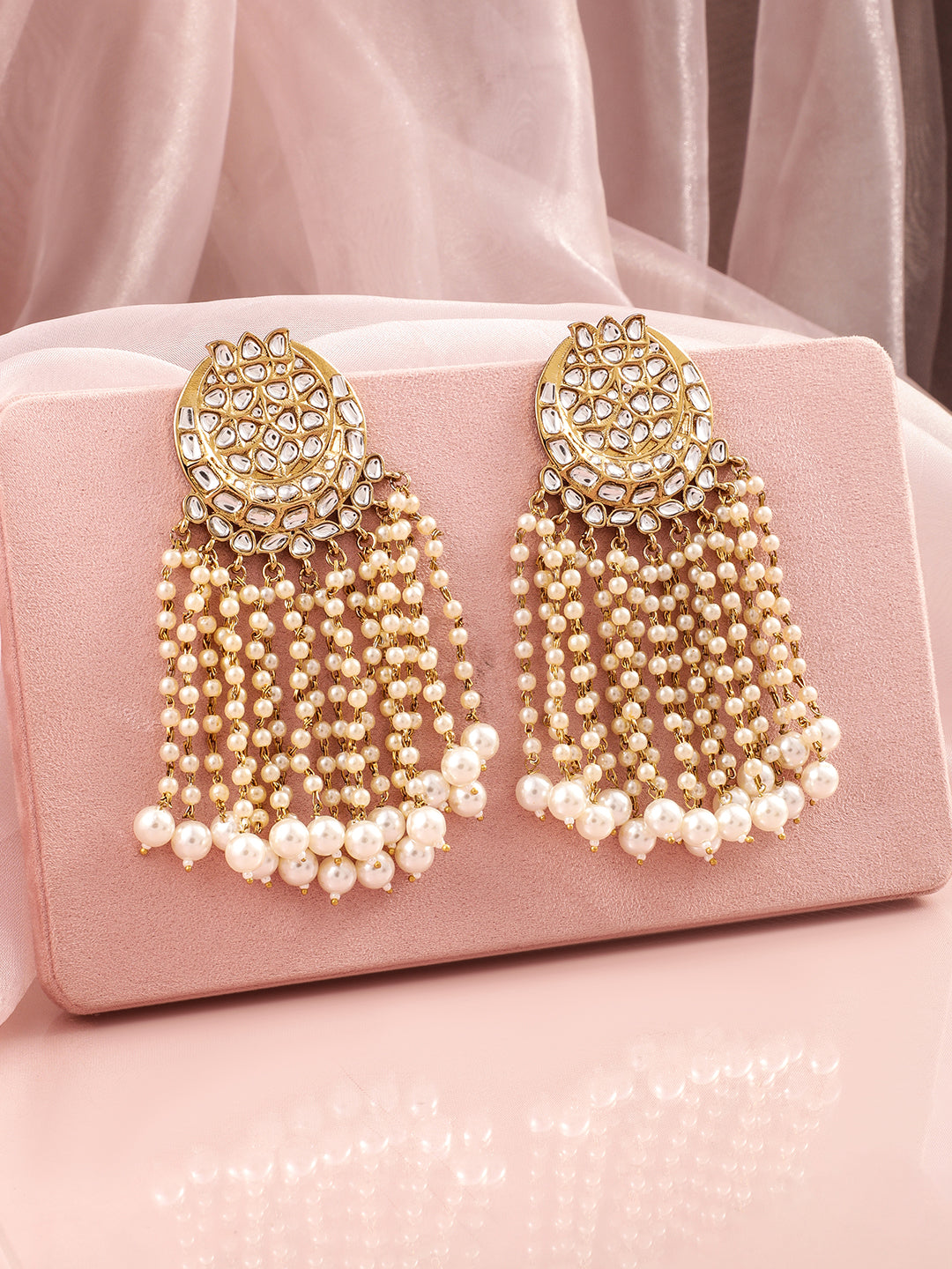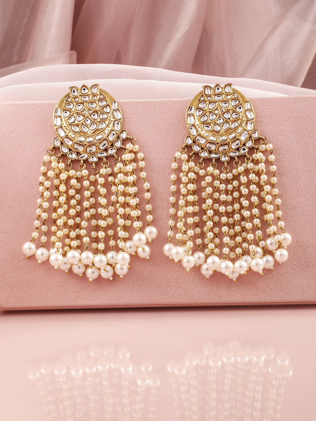 These 18K mehandi gold-plated chandelier earrings feature intricate Kundan work and cascading layers of white pearls, making them a stunning choice for bridal or traditional festive wear.