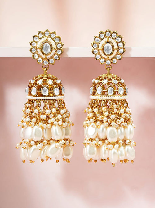 Earrings : These 22K gold-plated dome jhumkas feature handcrafted floral studs, white Kundan stones, and layered off-white round and oval pearl beads for a regal festive look.