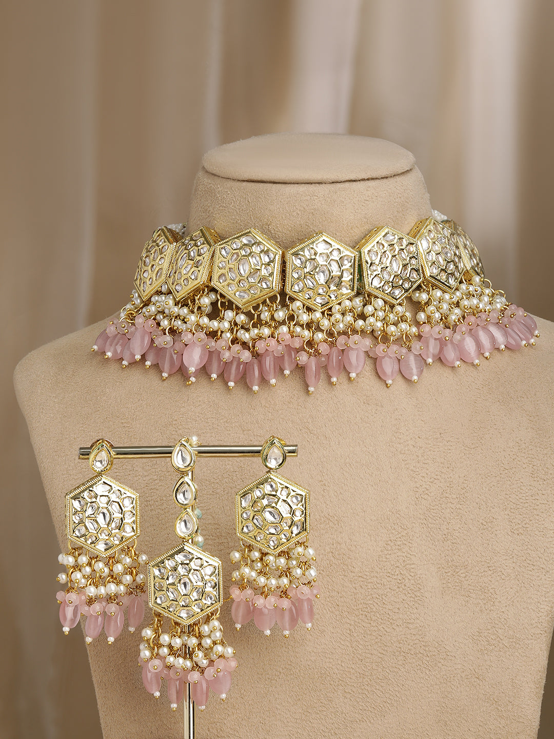 It's a jewellery set fit for the queens! Exude the royal vibe with this stone studded jewellery set. Consisting of a necklace, matching earrings, this necklace set is crafted from gold-plated brass, stones and beads.