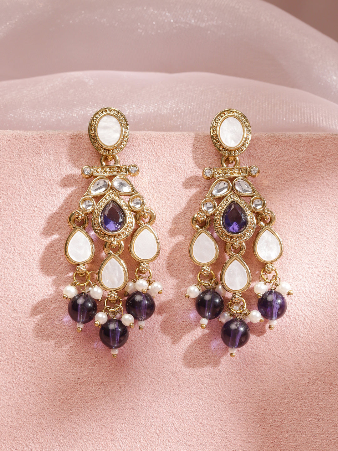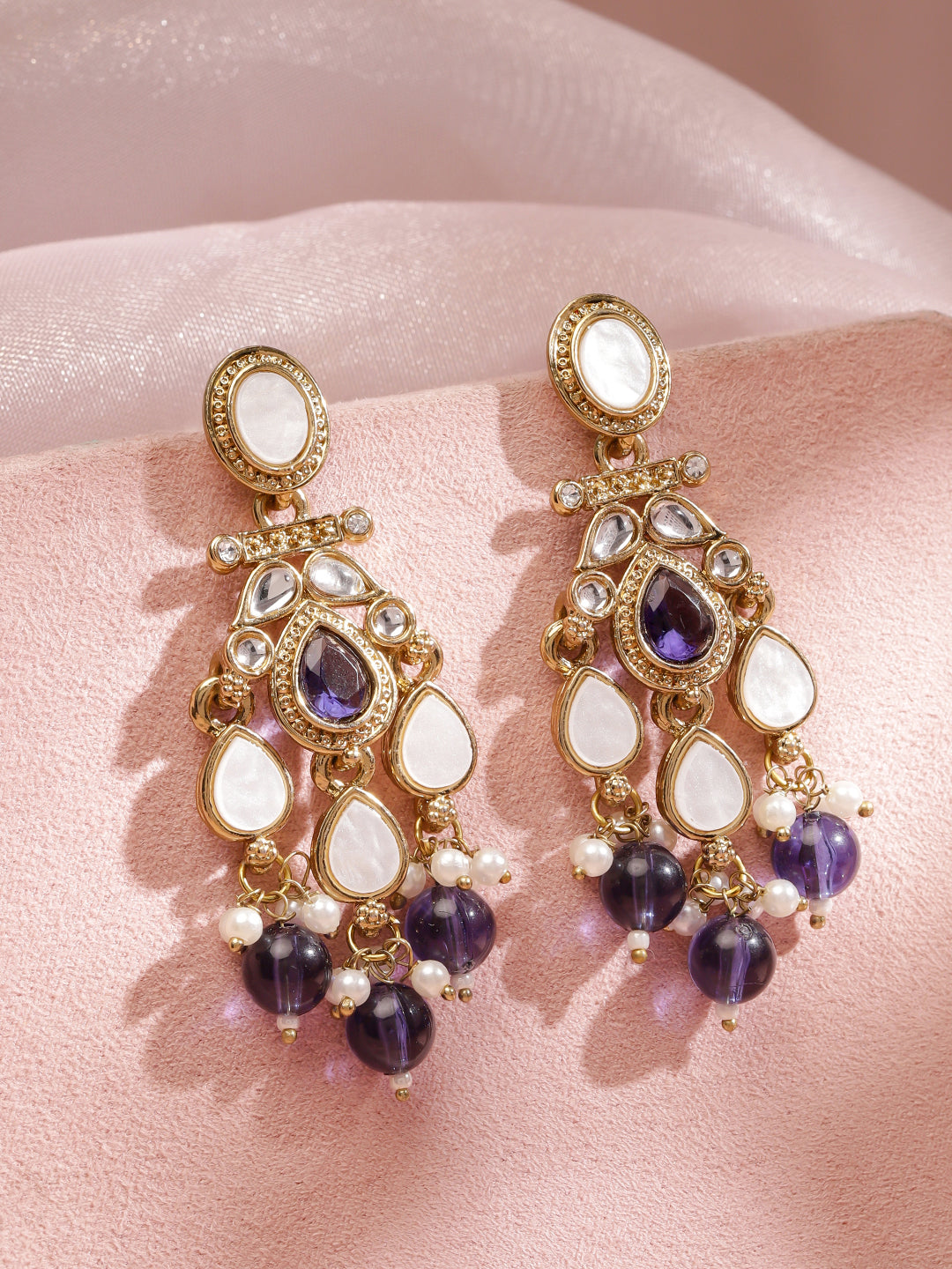 Earrings : An opulent 22K gold-plated chandelier earring pair in brass, adorned with kundan, Cubic Zirconia, glossy pearls and purple beads—ideal for weddings, parties, festive and grand occasions.