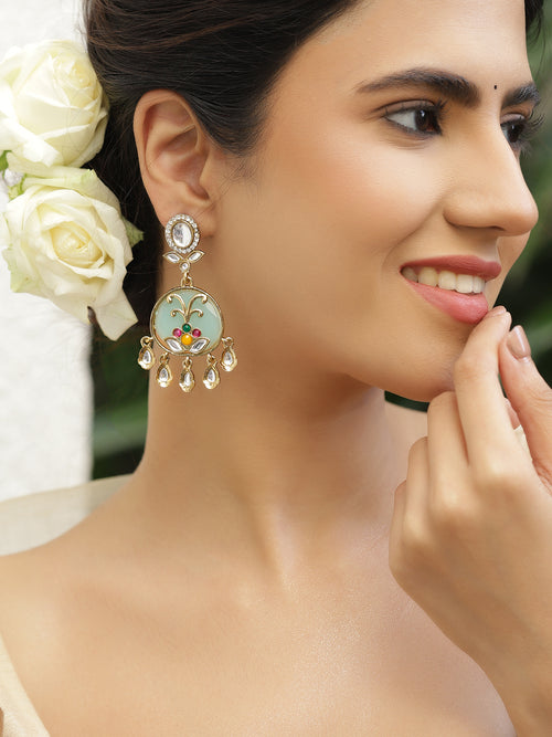 A statement of elegance, these Rubans 22K gold-plated chandelier earrings feature pastel green enamel and white Kundan stones, perfect for festive, wedding, and traditional occasions.